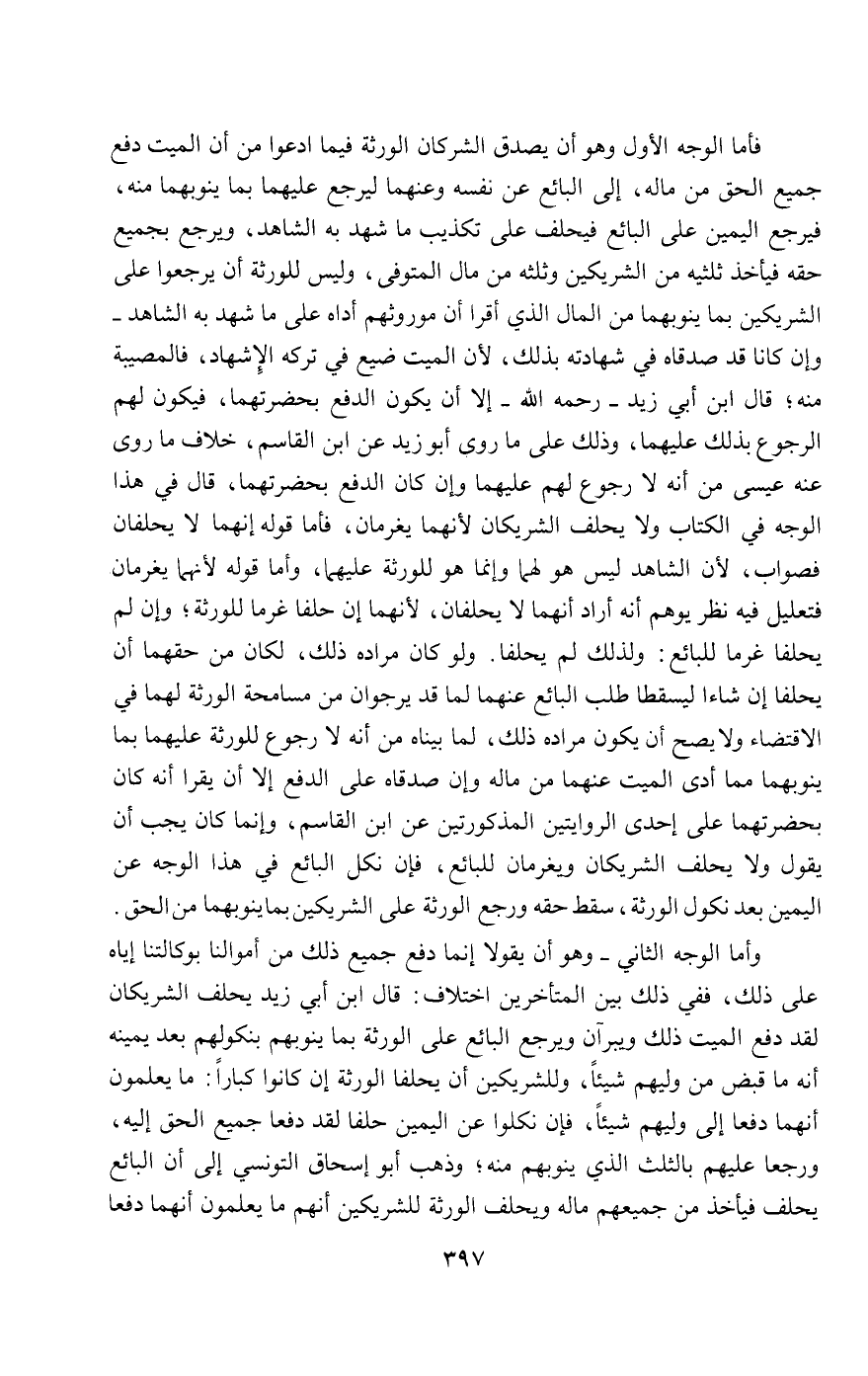 وأما الوجه الثاني - وهو أن يقولا إنما دفع جميع ذلك من أموالنا بوكالتنا إياه على ذلك، ففي ذلك بين المتأخرين اختلاف: قال ابن أبي زيد يحلف الشريكان لقد دفع الميت ذلك ويبرآن ويرجع البائع على الورثة بما ينوبهم بنكولهم بعد يمينه أنه ما قبض من وليهم شيئا، وللشريكين أن يحلفا الورثة إن كانوا كبارا: ما يعلمون أنهما دفعا إلى وليهم شيئا، فإن نكلوا عن اليمين حلفا لقد دفعا جميع الحق إليه، ورجعا عليهم بالثلث الذي ينوبهم منه؛ وذهب أبو إسحاق التونسي إلى أن البائع يحلف فيأخذ من جميعهم ماله ويحلف الورثة للشريكين أنهم ما يعلمون أنهما دفعا