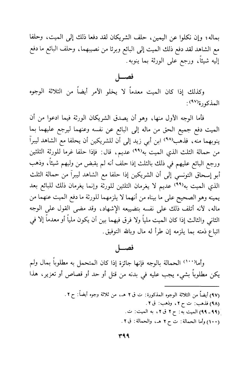 فأما الوجه الأول منها، وهو أن يصدق الشريكان الورثة فيما ادعوا من أن الميت دفع جميع الحق من ماله إلى البائع عن نفسه وعنهما ليرجع عليهما بما ينوبهما منه، فذهب ابن أبي زيد إلى أن للشريكين أن يحلفا مع الشاهد ليبرآ من حمالة الثلث الذي الميت به عديم، قال: فإذا حلفا غرما للورثة الثلثين ورجع البائع عليهم في ذلك بالثلث إذا حلف أنه لم يقبض من وليهم شيئا، وذهب أبو إسحاق التونسي إلى أن الشريكين إذا حلفا مع الشاهد ليبرآ من حمالة الثلث الذي الميت به عديم لا يغرمان الثلثين للورثة وإنما يغرمان ذلك للبائع بعد يمينه وهو الصحيح على ما بيناه من أنهما لا يلزمهما للورثة ما دفع الميت عنهما من ماله، لأنه أتلف ذلك على نفسه بتضييعه الإشهاد، وقد مضى القول على الوجه الثاني والثالث إذا كان الميت مليا ولا فرق فيهما بين أن يكون مليا أو معدما إلا في اتباع ذمته بما يلزمه إن طرأ له مال وبالله التوفيق.