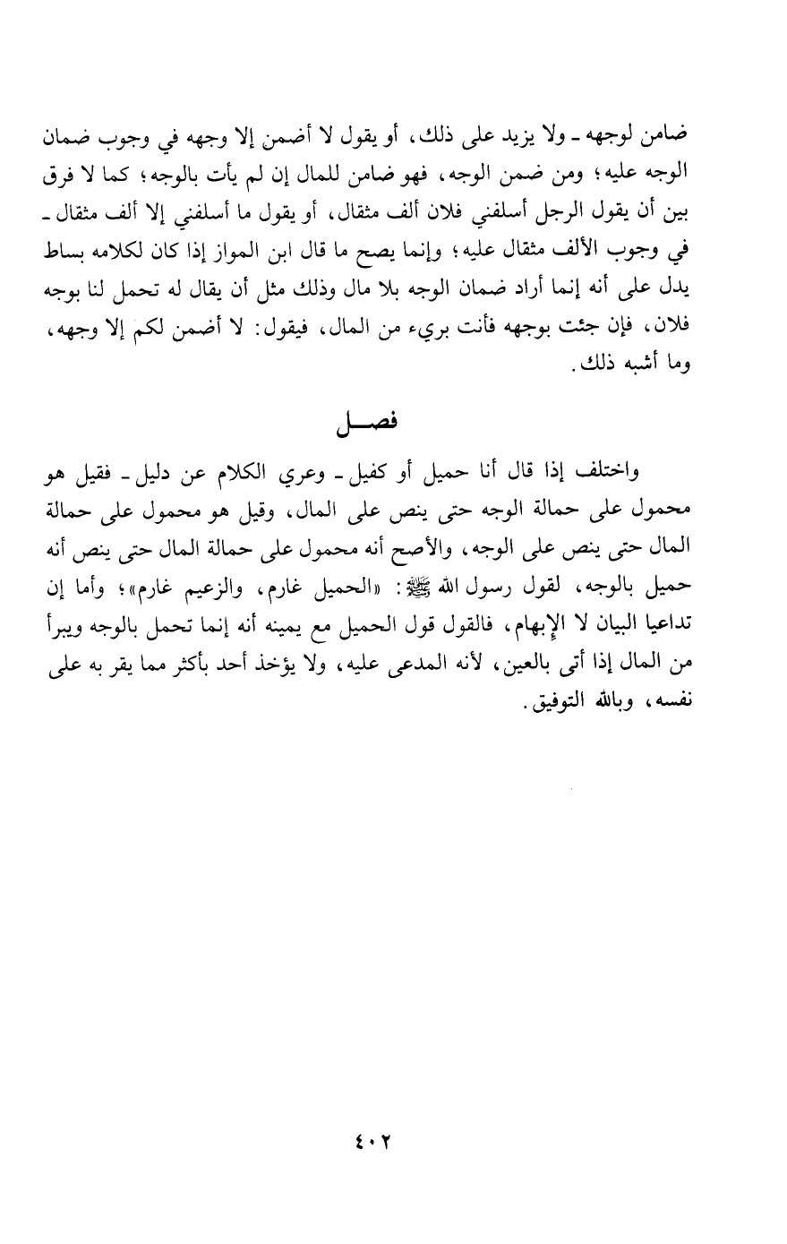 ضامن لوجهه - ولا يزيد على ذلك، أو يقول لا أضمن إلا وجهه في وجوب ضمان الوجه عليه؛ ومن ضمن الوجه، فهو ضامن للمال إن لم يأت بالوجه؛ كما لا فرق بين أن يقول الرجل أسلفني فلان ألف مثقال، أو يقول ما أسلفني إلا ألف مثقال - في وجوب الألف مثقال عليه، وإنما يصح ما قال ابن المواز إذا كان لكلامه بساط يدل على أنه إنما أراد ضمان الوجه بلا مال وذلك مثل أن يقال له تحمل لنا بوجه فلان، فإن جئت بوجهه فأنت بريء من المال، فيقول: لا أضمن لكم إلا وجهه، وما أشبه ذلك.