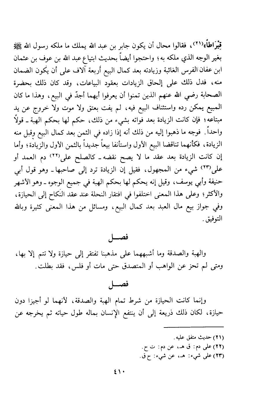 قيراطا»، فقالوا محال أن يكون جابر بن عبد الله يملك ما ملكه رسول الله - صَلَّى اللَّهُ عَلَيْهِ وَسَلَّمَ - بغير الوجه الذي ملكه به، واحتجوا أيضا بحديث ابتياع عبد الله بن عوف بن عثمان بن عفان الفرس الغائبة وزيادته بعد كمال البيع أربعة آلاف على أن يكون الضمان منه، فدل ذلك على إلحاق الزيادات بعقود البياعات، وقد كان ذلك بحضرة الصحابة - رَضِيَ اللَّهُ عَنْهُمْ - الذين تمنوا أن يعرفوا أيهما أجد في البيع، وهذا ما كان المبيع يمكن رده واستئناف البيع فيه، لم يفت بعتق ولا موت ولا خروج عن يد مبتاعه؛ فإن كانت الزيادة بعد فواته بشيء من ذلك، حكم لها بحكم الهبة - قولا واحدا. فوجه ما ذهبوا إليه من ذلك أنه إذا زاده في الثمن بعد كمال البيع وقبل منه الزيادة، فكأنهما تناقضا البيع الأول واستأنفا بيعا جديدا بالثمن الأول والزيادة؛ وأما إن كانت الزيادة بعد عقد ما لا يصح نقضه - كالصلح على دم العمد أو على شيء من المجهول، فقيل إن الزيادة ترد إلى صاحبها - وهو قول أبي حنيفة وأبي يوسف، وقيل إنه يحكم لها بحكم الهبة في جميع الوجوه - وهو الأشهر والأكثر؛ وعلى هذا المعنى اختلفوا في افتقار النحلة عند عقد النكاح إلى الحيازة، وفي جواز بيع مال العبد بعد كمال البيع، ومسائل من هذا المعنى كثيرة وبالله التوفيق.