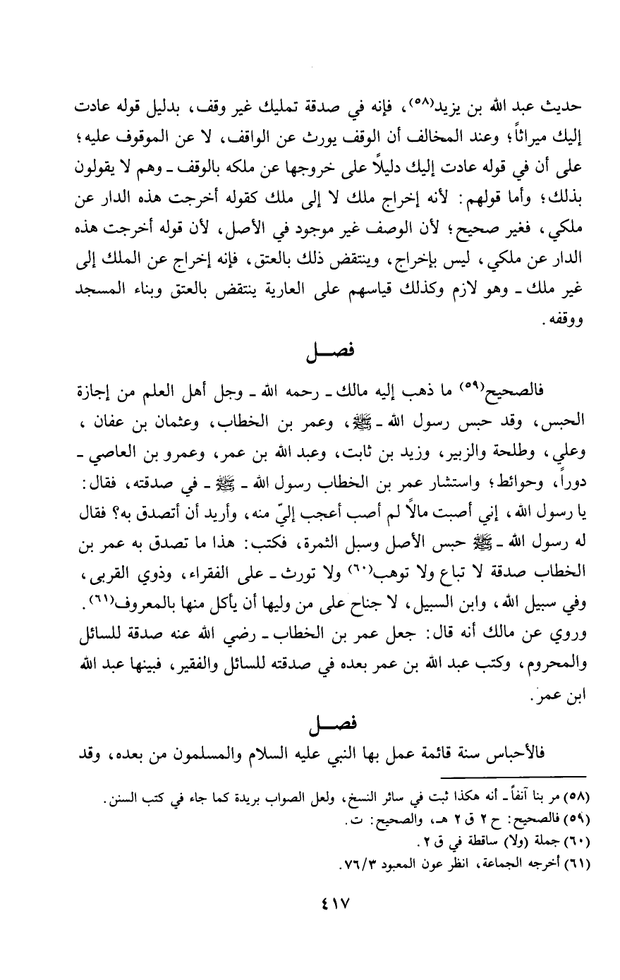 فالصحيح ما ذهب إليه مالك - رَحِمَهُ اللَّهُ - وجل أهل العلم من إجازة الحبس، وقد حبس رسول الله - صَلَّى اللَّهُ عَلَيْهِ وَسَلَّمَ -، وعمر بن الخطاب، وعثمان بن عفان، وعلي، وطلحة والزبير، وزيد بن ثابت، وعبد الله بن عمر، وعمرو بن العاص - دورا، وحوائط، «واستشار عمر بن الخطاب رسول الله - صَلَّى اللَّهُ عَلَيْهِ وَسَلَّمَ - في صدقته، فقال: يا رسول الله، إني أصبت مالا لم أصب أعجب إلي منه، وأريد أن أتصدق به؛ فقال له رسول الله - صَلَّى اللَّهُ عَلَيْهِ وَسَلَّمَ - حبس الأصل وسبل الثمرة، فكتب: هذا ما تصدق به عمر بن الخطاب صدقة لا تباع ولا توهب ولا تورث - على الفقراء، وذوي القربى، وفي سبيل الله، وابن السبيل، لا جناح على من وليها أن يأكل منها بالمعروف». وروي عن مالك أنه قال: جعل عمر بن الخطاب - رَضِيَ اللَّهُ عَنْهُ - صدقة للسائل والمحروم، وكتب عبد الله بن عمر بعده في صدقته للسائل والفقير، فبينها عبد الله بن عمر.