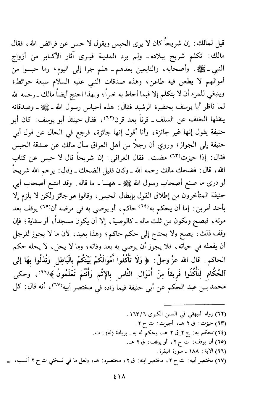 قيل لمالك: إن شريحا كان لا يرى الحبس ويقول لا حبس عن فرائض الله، فقال مالك: تكلم شريح ببلاده - ولم يرد المدينة فيرى آثار الأكابر من أزواج النبي - صَلَّى اللَّهُ عَلَيْهِ وَسَلَّمَ -. وأصحابه، والتابعين بعدهم - هلم جرا إلى اليوم؛ وما حبسوا من أموالهم لا يطعن فيه طاعن؛ وهذه صدقات النبي - عَلَيْهِ السَّلَامُ - سبعة حوائط؛ وينبغي للمرء أن لا يتكلم إلا فيما أحاط به خبرا؛ وبهذا احتج أيضا مالك - رَحِمَهُ اللَّهُ - لما ناظر أبا يوسف بحضرة الرشيد فقال: هذه أحباس رسول الله - صَلَّى اللَّهُ عَلَيْهِ وَسَلَّمَ - وصدقاته ينقلها الخلف عن السلف - قرنا بعد قرن، فقال حينئذ أبو يوسف: كان أبو حنيفة يقول إنها غير جائزة، وأنا أقول إنها جائزة، فرجع في الحال عن قول أبي حنيفة إلى الجواز، وروي أن رجلا من أهل العراق سأل مالك عن صدقة الحبس فقال: إذا حيزت مضت. فقال العراقي: إن شريحا قال لا حبس عن كتاب الله، قال: فضحك مالك - رَحِمَهُ اللَّهُ - وكان قليل الضحك - وقال: يرحم الله شريحا لو درى ما صنع أصحاب رسول الله - صَلَّى اللَّهُ عَلَيْهِ وَسَلَّمَ - ههنا - ما قاله. وقد امتنع أصحاب أبي حنيفة المتأخرون من إطلاق القول بإبطال الحبس، وقالوا هو جائز ولكن لا يلزم إلا بأحد أمرين: إما أن يحكم به حاكم، أو يوصي به في مرضه أن يوقف بعد موته، فيصح ويكون من ثلث ماله - كالوصية، إلا أن يكون مسجدا، أو سقاية؛ فإن وقف ذلك، يصح ولا يحتاج إلى حكم حاكم؛ وهذا بعيد، لأن ما لا يجوز للرجل أن يفعله في حياته، فلا يجوز أن يوصي به بعد وفاته، وما لا يحل، لا يحله حكم الحاكم. قال الله عز وجل: {وَلا تَأْكُلُوا أَمْوَالَكُمْ بَيْنَكُمْ بِالْبَاطِلِ وَتُدْلُوا بِهَا إِلَى الْحُكَّامِ لِتَأْكُلُوا فَرِيقًا مِنْ أَمْوَالِ النَّاسِ بِالإِثْمِ وَأَنْتُمْ تَعْلَمُونَ} [البقرة: 188]، وحكى محمد بن عبد الحكم عن أبي حنيفة فيما زاده في مختصر أبيه، أنه قال: كل