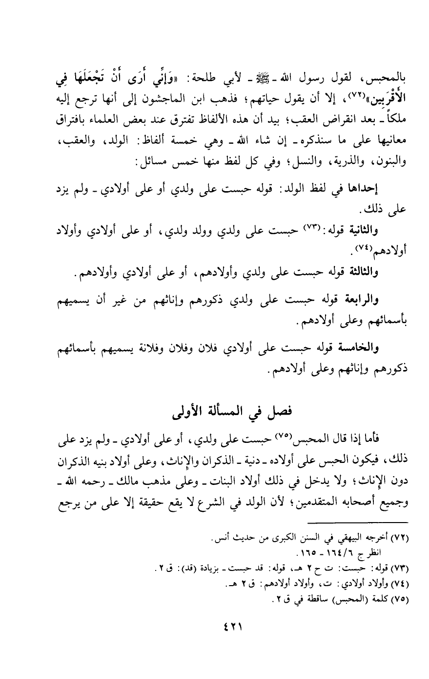 بالمحبس، «لقول رسول الله - صَلَّى اللَّهُ عَلَيْهِ وَسَلَّمَ - لأبي طلحة: " وإني أرى أن تجعلها في الأقربين»، إلا أن يقول حياتهم؛ فذهب ابن الماجشون إلى أنها ترجع إليه ملكا - بعد انقراض العقب، بيد أن هذه الألفاظ تفترق عند بعض العلماء بافتراق معانيها على ما سنذكره - إن شاء الله - وهي خمسة ألفاظ: الولد، والعقب، والبنون، والذرية، والنسل؛ وفي كل لفظ منها خمس مسائل: