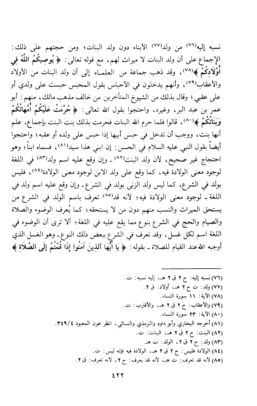 نسبه إليه من ولد الأبناء دون ولد البنات؛ ومن حجتهم على ذلك: الإجماع على أن ولد البنات لا ميراث لهم، مع قَوْله تَعَالَى: {يُوصِيكُمُ اللَّهُ فِي أَوْلادِكُمْ} [النساء: 11]، وقد ذهب جماعة من العلماء إلى أن ولد البنات من الأولاد والأعقاب، وأنهم يدخلون في الأحباس بقول المحبس حبست على ولدي أو على عقبي؛ وقال بذلك من الشيوخ المتأخرين من خالف مذهب مالك، منهم: أبو عمر بن عبد البر، وغيره، واحتجوا بقول الله تعالى: {حُرِّمَتْ عَلَيْكُمْ أُمَّهَاتُكُمْ وَبَنَاتُكُمْ} [النساء: 23]، قالوا فلما حرم الله البنات فحرمت بذلك بنت البنت بإجماع، علم أنها بنت، ووجب أن تدخل في حبس أبيها إذا حبس على ولده أو عقبه؛ واحتجوا أيضا «بقول النبي - عَلَيْهِ السَّلَامُ - في الحسن: إن ابني هذا سيد» فسماه ابنا؛ وهو احتجاج غير صحيح، لأن ولد البنت - وإن وقع عليه اسم ولد في اللغة لوجود معنى الولادة فيه، كما وقع على ولد الابن لوجود معنى الولادة، فليس بولد في الشرع، كما ليس ولد الزنى بولد في الشرع - وإن وقع عليه اسم ولد في اللغة - لوجود معنى الولادة فيه، لأنه قد تعرف باسم الولد في الشرع من يستحق الميراث والنسب منهم دون من لا يستحقه؛ كما يعرف الوضوء والصلاة والصيام والحج في الشرع بنوع مما يقع عليه في اللغة، ألا ترى أن الوضوء في اللغة اسم لكل غسل، وقد تعرف في الشرع ببعض ذلك النوع - وهو الغسل الذي أوجبه الله عند القيام للصلاة - بقوله: {يَا أَيُّهَا الَّذِينَ آمَنُوا إِذَا قُمْتُمْ إِلَى الصَّلاةِ} [المائدة: 6]