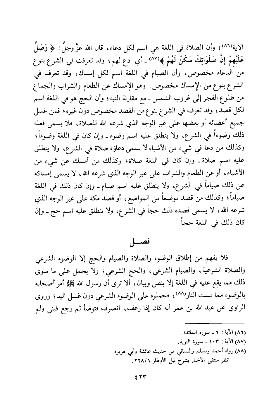 الآية، وأن الصلاة في اللغة هي اسم لكل دعاء، قال الله عز وجل: {وَصَلِّ عَلَيْهِمْ إِنَّ صَلاتَكَ سَكَنٌ لَهُمْ} [التوبة: 103]- أي ادع لهم، وقد تعرفت في الشرع بنوع من الدعاء مخصوص، وأن الصيام في اللغة اسم لكل إمساك، وقد تعرف في الشرع بنوع من الإمساك مخصوص، وهو الإمساك عن الطعام والشراب والجماع من طلوع الفجر إلى غروب الشمس - مع مقارنة النية، وأن الحج هو في اللغة اسم لكل قصد، وقد تعرف في الشرع بنوع من القصد مخصوص دون غيره؛ فمن غسل جميع أعضائه أو بعضها على غير الوجه الذي شرعه الله للصلاة، فلا يسمى فعله ذلك وضوءا في الشرع، ولا ينطلق عليه اسم وضوء - وإن كان في اللغة وضوءا؛ وكذلك من دعا في شيء من الأشياء لا يسمى دعاؤه صلاة في الشرع، ولا ينطلق عليه اسم صلاة - وإن كان في اللغة صلاة، وكذلك من أمسك عن شيء من الأشياء، أو عن الطعام والشراب على غير الوجه الذي شرعه الله، لا يسمى إمساكه عن ذلك صياما في الشرع، ولا ينطلق عليه اسم صيام - وإن كان ذلك في اللغة صياما، وكذلك من قصد موضعا من المواضع، أو قصد مكة على غير الوجه الذي شرعه الله، لا يسمى قصده ذلك حجا في الشرع، ولا ينطلق عليه اسم حج - وإن كان ذلك في اللغة حجا.