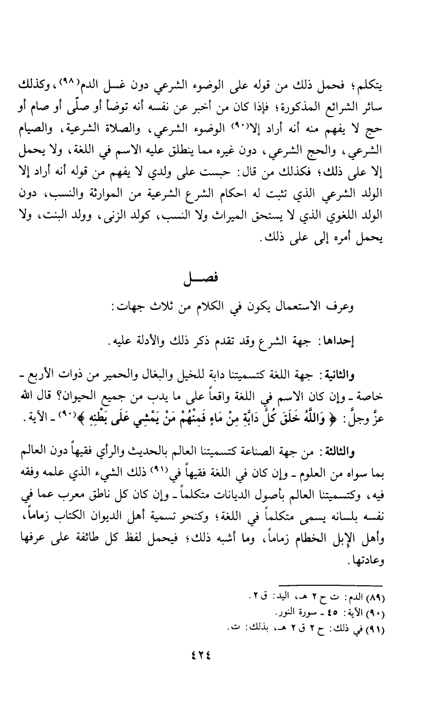 والثانية: جهة اللغة كتسميتنا دابة للخيل والبغال والحمير من ذوات الأربع - خاصة - وإن كان الاسم في اللغة واقعا على ما يدب من جميع الحيوان؛ قال الله عز وجل: {وَاللَّهُ خَلَقَ كُلَّ دَابَّةٍ مِنْ مَاءٍ فَمِنْهُمْ مَنْ يَمْشِي عَلَى بَطْنِهِ} [النور: 45]- الآية.