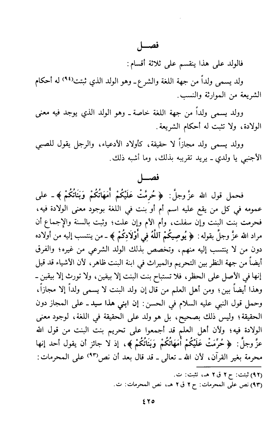 فحمل قول الله عز وجل: {حُرِّمَتْ عَلَيْكُمْ أُمَّهَاتُكُمْ وَبَنَاتُكُمْ} [النساء: 23]- على عمومه في كل من يقع عليه اسم أم أو بنت في اللغة بوجود معنى الولادة فيه، فحرمت بنت البنت وإن سفلت، وأم الأم وإن علت؛ وثبت بالسنة والإجماع أن مراد الله عز وجل بقوله: {يُوصِيكُمُ اللَّهُ فِي أَوْلادِكُمْ} [النساء: 11]- من ينتسب إليه من أولاده دون من لا ينتسب إليه منهم، وتخصص بذلك الولد الشرعي من غيره، والفرق أيضا من جهة النظر بين التحريم والميراث في ابنة البنت ظاهر، لأن الأشياء قد قيل إنها في الأصل على الحظر، فلا تستباح بنت البنت إلا بيقين، ولا تورث إلا بيقين - وهذا أيضا بين؛ ومن أهل العلم من قال إن ولد البنت لا يسمى ولدا إلا مجازا، وحمل «قول النبي - عَلَيْهِ السَّلَامُ - في الحسن: إن ابني هذا سيد» - على المجاز دون الحقيقة؛ وليس ذلك بصحيح، بل هو ولد على الحقيقة في اللغة، لوجود معنى الولادة فيه؛ ولأن أهل العلم قد أجمعوا على تحريم بنص البنت من قول الله عز وجل: {حُرِّمَتْ عَلَيْكُمْ أُمَّهَاتُكُمْ وَبَنَاتُكُمْ} [النساء: 23]، إذ لا جائز أن يقول أحد إنها محرمة بغير القرآن، لأن الله - تعالى - قد قال بعد أن نص على المحرمات: