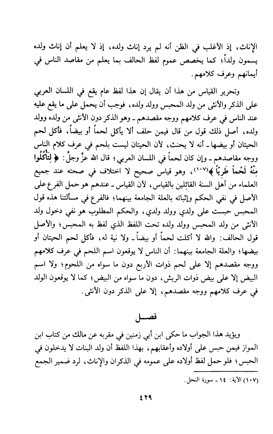 وتحرير القياس من هذا أن يقال إن هذا لفظ عام يقع في اللسان العربي على الذكر والأنثى من ولد المحبس وولد ولده، فوجب أن يحمل على ما يقع عليه عند الناس في عرف كلامهم ووجه مقصدهم - وهو الذكر دون الأنثى من ولده وولد ولده، أصل ذلك قول من قال فيمن حلف ألا يأكل لحما أو بيضا، فأكل لحم الحيتان أو بيضها - أنه لا يحنث، لأن الحيتان ليست بلحم في عرف كلام الناس ووجه مقاصدهم - وإن كان لحما في اللسان العربي؛ قال الله عز وجل: {لِتَأْكُلُوا مِنْهُ لَحْمًا طَرِيًّا} [النحل: 14]، وهو قياس صحيح لا اختلاف في صحته عند جميع العلماء من أهل السنة القائلين بالقياس، لأن القياس - عندهم هو حمل الفرع على الأصل في نفي الحكم وإثباته بالعلة الجامعة بينهما؛ فالفرع في مسألتنا هذه قول المحبس حبست على ولدي وولد ولدي، والحكم المطلوب هو نفي دخول ولد الأنثى من ولد المحبس وولد ولده تحت اللفظ الذي لفظ به المحبس، والأصل قول الحالف: والله لا أكلت لحما أو بيضا - ولا نية له، فأكل لحم الحيتان أو بيضها؛ والعلة الجامعة بينهما: أن الناس لا يوقعون اسم اللحم في عرف كلامهم ووجه مقصدهم إلا على لحم ذوات الأربع دون ما سواه من اللحوم؛ ولا اسم البيض إلا على بيض ذوات الريش، دون ما سواه من البيض؛ كما لا يوقعون الولد في عرف كلامهم ووجه مقصدهم، إلا على الذكر دون الأنثى.