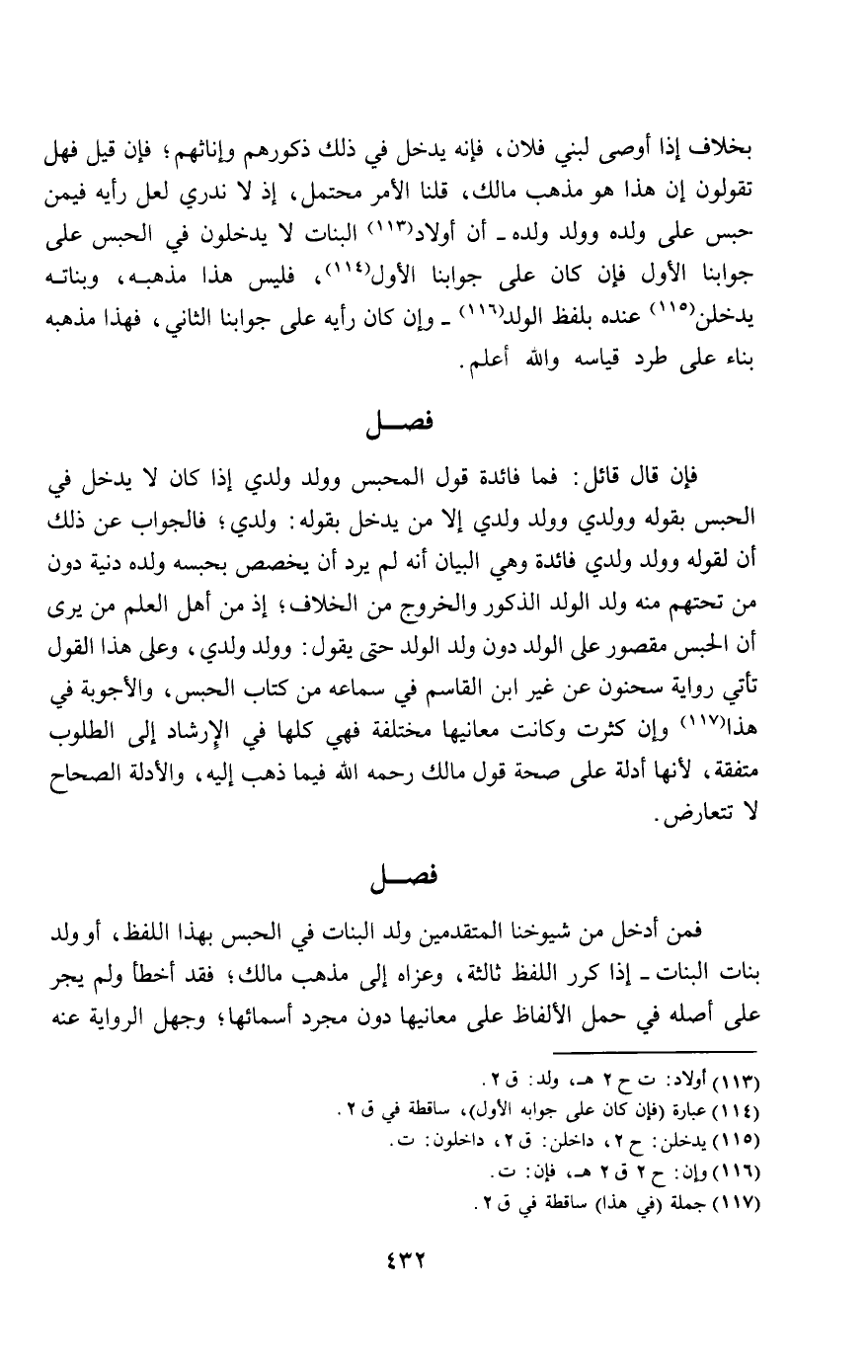 بخلاف إذا أوصى لبني فلان، فإنه يدخل في ذلك ذكورهم وإناثهم؛ فإن قيل فهل تقولون إن هذا هو مذهب مالك، قلنا الأمر محتمل، إذ لا ندري لعل رأيه فيمن حبس على ولده وولد ولده - أن أولاد البنات لا يدخلون في الحبس على جوابنا الأول فإن كان على جوابنا الأول، فليس هذا مذهبه، وبناته يدخلن عنده بلفظ الولد - وإن كان رأيه على جوابنا الثاني، فهذا مذهبه بناء على طرد قياسه والله أعلم.