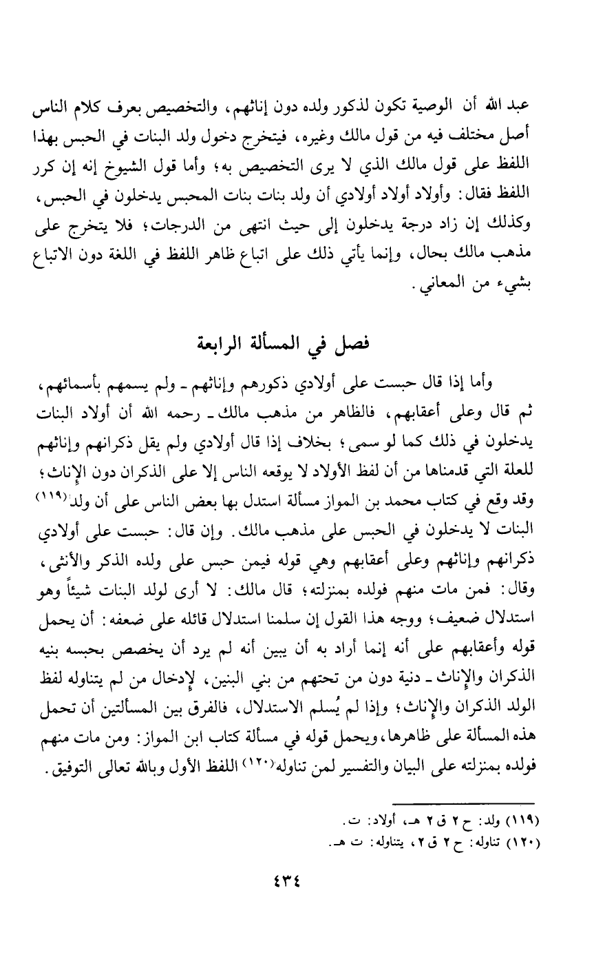 عبد الله أن الوصية تكون لذكور ولده دون إناثهم، والتخصيص بعرف كلام الناس أصل مختلف فيه من قول مالك وغيره، فيتخرج دخول ولد البنات في الحبس بهذا اللفظ على قول مالك الذي لا يرى التخصيص به؛ وأما قول الشيوخ إنه إن كرر اللفظ فقال: وأولاد أولاد أولادي أن ولد بنات بنات المحبس يدخلون في الحبس، وكذلك إن زاد درجة يدخلون إلى حيث انتهى من الدرجات؛ فلا يتخرج على مذهب مالك بحال، وإنما يأتي ذلك على اتباع ظاهر اللفظ في اللغة دون الاتباع بشيء من المعاني.