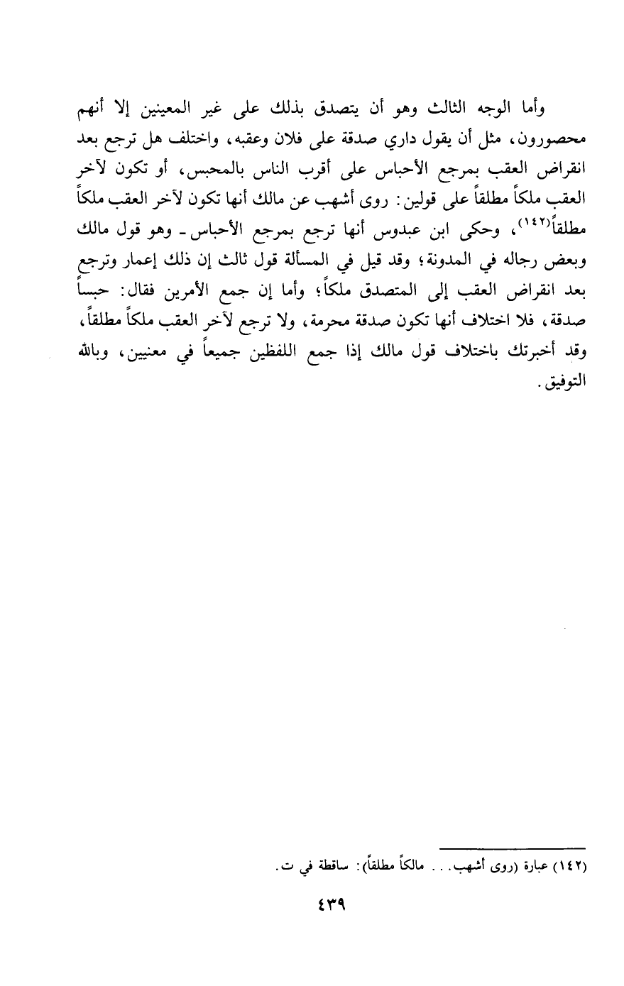 وأما الوجه الثالث وهو أن يتصدق بذلك على غير المعينين إلا أنهم محصورون، مثل أن يقول داري صدقة على فلان وعقبه، واختلف هل ترجع بعد انقراض العقب بمرجع الأحباس على أقرب الناس بالمحبس، أو تكون لآخر العقب ملكا مطلقا على قولين: روى أشهب عن مالك أنها تكون لآخر العقب ملكا مطلقا، وحكى ابن عبدوس أنها ترجع بمرجع الأحباس - وهو قول مالك وبعض رجاله في المدونة، وقد قيل في المسألة قول ثالث إن ذلك إعمار وترجع بعد انقراض العقب إلى المتصدق ملكا؛ وأما إن جمع الأمرين فقال: حبسا صدقة، فلا اختلاف أنها تكون صدقة محرمة، ولا ترجع لآخر العقب ملكا مطلقا، وقد أخبرتك باختلاف قول مالك إذا جمع اللفظين جميعا في معنيين، وبالله التوفيق.