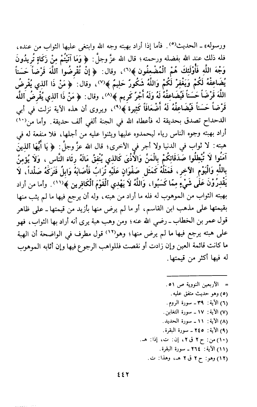 ورسوله» - الحديث. فأما إذا أراد بهبته وجه الله وابتغى عليها الثواب من عنده، فله ذلك عند الله بفضله ورحمته؛ قال الله عز وجل: {وَمَا آتَيْتُمْ مِنْ زَكَاةٍ تُرِيدُونَ وَجْهَ اللَّهِ فَأُولَئِكَ هُمُ الْمُضْعِفُونَ} [الروم: 39]، وقال: {إِنْ تُقْرِضُوا اللَّهَ قَرْضًا حَسَنًا يُضَاعِفْهُ لَكُمْ وَيَغْفِرْ لَكُمْ وَاللَّهُ شَكُورٌ حَلِيمٌ} [التغابن: 17]، وقال: {مَنْ ذَا الَّذِي يُقْرِضُ اللَّهَ قَرْضًا حَسَنًا فَيُضَاعِفَهُ لَهُ وَلَهُ أَجْرٌ كَرِيمٌ} [الحديد: 11]، وقال: {مَنْ ذَا الَّذِي يُقْرِضُ اللَّهَ قَرْضًا حَسَنًا فَيُضَاعِفَهُ لَهُ أَضْعَافًا كَثِيرَةً} [البقرة: 245]، ويروى أن هذه الآية نزلت في أبي الدحداح تصدق بحديقة له فأعطاه الله في الجنة ألفي ألف حديقة. وأما من أراد بهبته وجوه الناس رياء ليحمدوه عليها ويثنوا عليه من أجلها، فلا منفعة له في هبته: لا ثواب في الدنيا ولا أجر في الأخرى؛ قال الله عز وجل: {يَا أَيُّهَا الَّذِينَ آمَنُوا لا تُبْطِلُوا صَدَقَاتِكُمْ بِالْمَنِّ وَالأَذَى كَالَّذِي يُنْفِقُ مَالَهُ رِئَاءَ النَّاسِ وَلا يُؤْمِنُ بِاللَّهِ وَالْيَوْمِ الآخِرِ فَمَثَلُهُ كَمَثَلِ صَفْوَانٍ عَلَيْهِ تُرَابٌ فَأَصَابَهُ وَابِلٌ فَتَرَكَهُ صَلْدًا لا يَقْدِرُونَ عَلَى شَيْءٍ مِمَّا كَسَبُوا وَاللَّهُ لا يَهْدِي الْقَوْمَ الْكَافِرِينَ} [البقرة: 264]. وأما من أراد بهبته الثواب من الموهوب له فله ما أراد من هبته، وله أن يرجع فيها ما لم يثب منها بقيمتها على مذهب ابن القاسم، أو ما لم يرض منها بأزيد من قيمتها - على ظاهر قول عمر بن الخطاب - رَضِيَ اللَّهُ عَنْهُ -؛ ومن وهب هبة يرى أنه أراد بها الثواب، فهو على هبته يرجع فيها ما لم يرض منها؛ وهو قول مطرف في الواضحة أن الهبة ما كانت قائمة العين وإن زادت أو نقصت فللواهب الرجوع فيها وإن أثابه الموهوب له فيها أكثر من قيمتها.