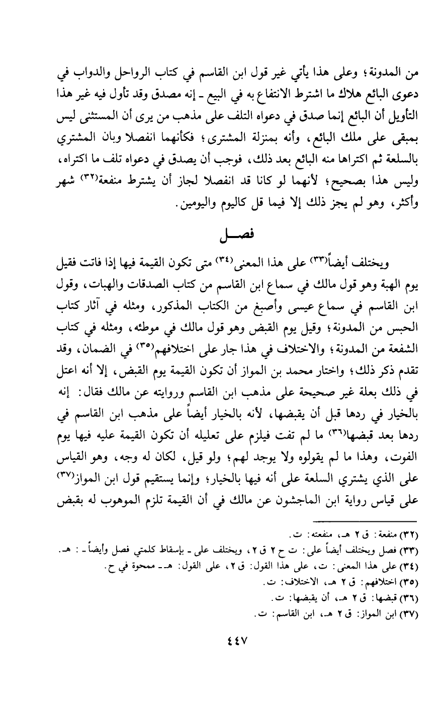 من المدونة؛ وعلى هذا يأتي غير قول ابن القاسم في كتاب الرواحل والدواب في دعوى البائع هلاك ما اشترط الانتفاع به في البيع - إنه مصدق وقد تأول فيه غير هذا التأويل أن البائع إنما صدق في دعواه التلف على مذهب من يرى أن المستثنى ليس بمبقى على ملك البائع، وأنه بمنزلة المشترى؛ فكأنهما انفصلا وبان المشتري بالسلعة ثم اكتراها منه البائع بعد ذلك، فوجب أن يصدق في دعواه تلف ما اكتراه، وليس هذا بصحيح؛ لأنهما لو كانا قد انفصلا لجاز أن يشترط منفعة شهر وأكثر، وهو لم يجز ذلك إلا فيما قل كاليوم واليومين.