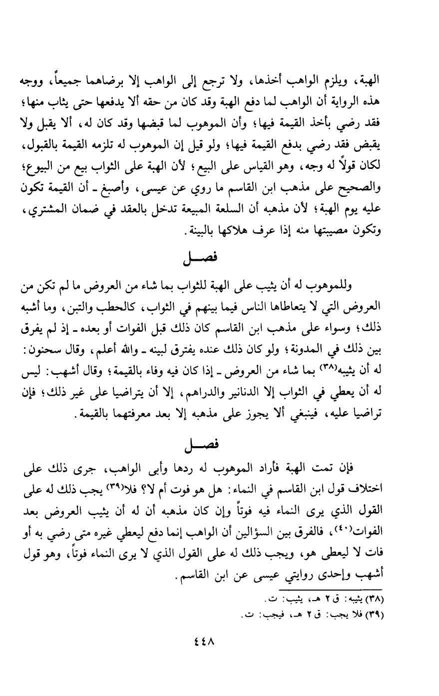 فإن تمت الهبة فأراد الموهوب له ردها وأبى الواهب، جرى ذلك على اختلاف قول ابن القاسم في النماء: هل هو فوت أم لا؟ فلا يجب ذلك له على القول الذي يرى النماء فيه فوتا وإن كان مذهبه أن له أن يثيب العروض بعد الفوات، فالفرق بين السؤالين أن الواهب إنما دفع ليعطي غيره متى رضي به أو فات لا ليعطى هو، ويجب ذلك له على القول الذي لا يرى النماء فوتا، وهو قول أشهب وإحدى روايتي عيسى عن ابن القاسم.
