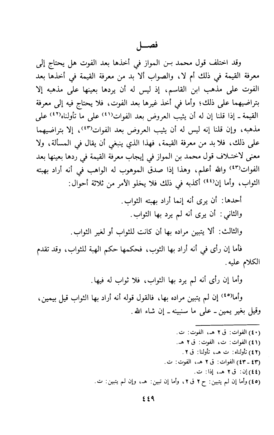 وقد اختلف قول محمد بن المواز في أخذها بعد الفوت هل يحتاج إلى معرفة القيمة في ذلك أم لا، والصواب ألا بد من معرفة القيمة في أخذها بعد الفوت على مذهب ابن القاسم، إذ ليس له أن يردها بعينها على مذهبه إلا بتراضيهما على ذلك؛ وأما في أخذ غيرها بعد الفوت، فلا يحتاج فيه إلى معرفة القيمة - إذا قلنا إن له أن يثيب العروض بعد الفوات على ما تأولناه على مذهبه، وإن قلنا إنه ليس له أن يثيب العروض بعد الفوات، إلا بتراضيهما على ذلك، فلا بد من معرفة القيمة، فهذا الذي ينبغي أن يقال في المسألة، ولا معنى لاختلاف قول محمد بن المواز في إيجاب معرفة القيمة في ردها بعينها بعد الفوات والله أعلم، وهذا إذا صدق الموهوب له الواهب في أنه أراد بهبته الثواب، وأما إن أكذبه في ذلك فلا يخلو الأمر من ثلاثة أحوال: