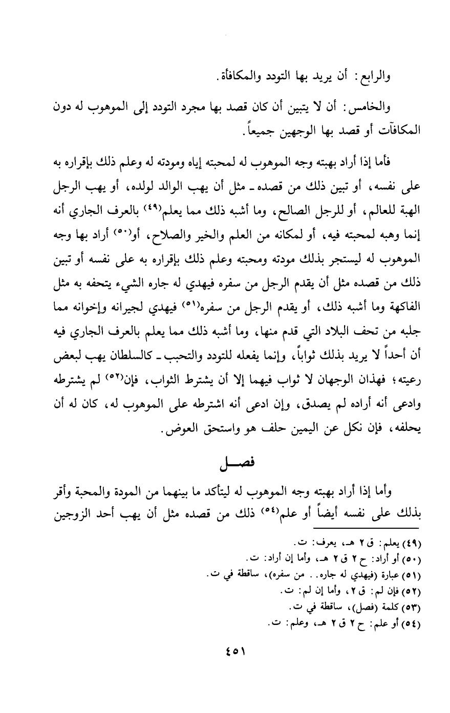 والخامس: أن لا يتبين أن كان قصد بها مجرد التودد إلى الموهوب له دون المكافآت أو قصد بها الوجهين جميعا.