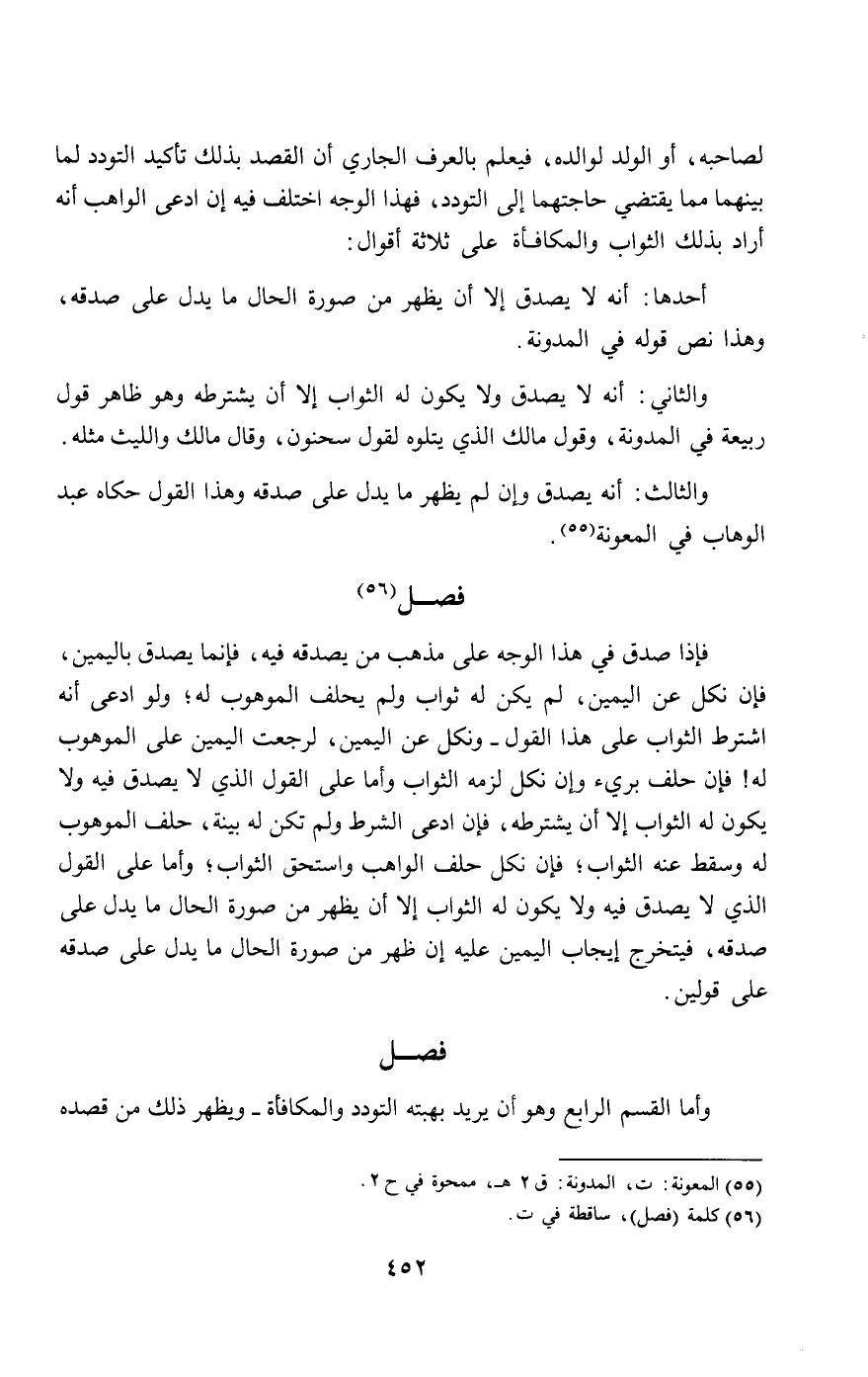 لصاحبه، أو الولد لوالده، فيعلم بالعرف الجاري أن القصد بذلك تأكيد التودد لما بينهما مما يقتضي حاجتهما إلى التودد، فهذا الوجه اختلف فيه إن ادعى الواهب أنه أراد بذلك الثواب والمكافأة على ثلاثة أقوال: