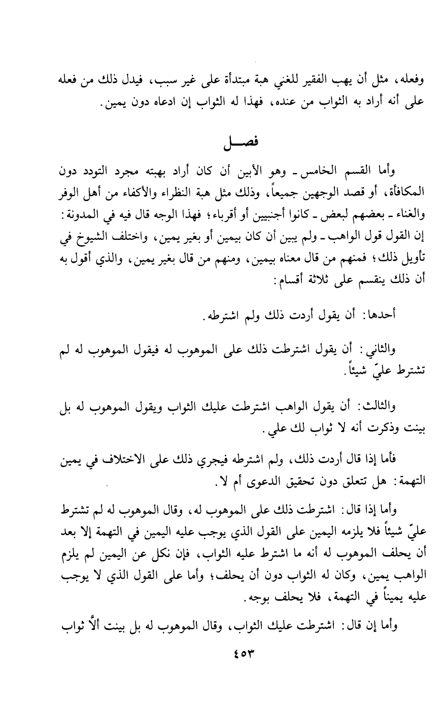 وأما القسم الخامس - وهو الأبين إن كان أراد بهبته مجرد التودد دون المكافأة، أو قصد الوجهين جميعا، وذلك مثل هبة النظراء والأكفاء من أهل الوفر والغناء - بعضهم لبعض - كانوا أجنبيين أو أقرباء، فهذا الوجه قال فيه في المدونة: إن القول قول الواهب - ولم يبين إن كان بيمين أو بغير يمين، واختلف الشيوخ في تأويل ذلك، فمنهم من قال معناه بيمين، ومنهم من قال بغير يمين، والذي أقول به إن ذلك ينقسم على ثلاثة أقسام: