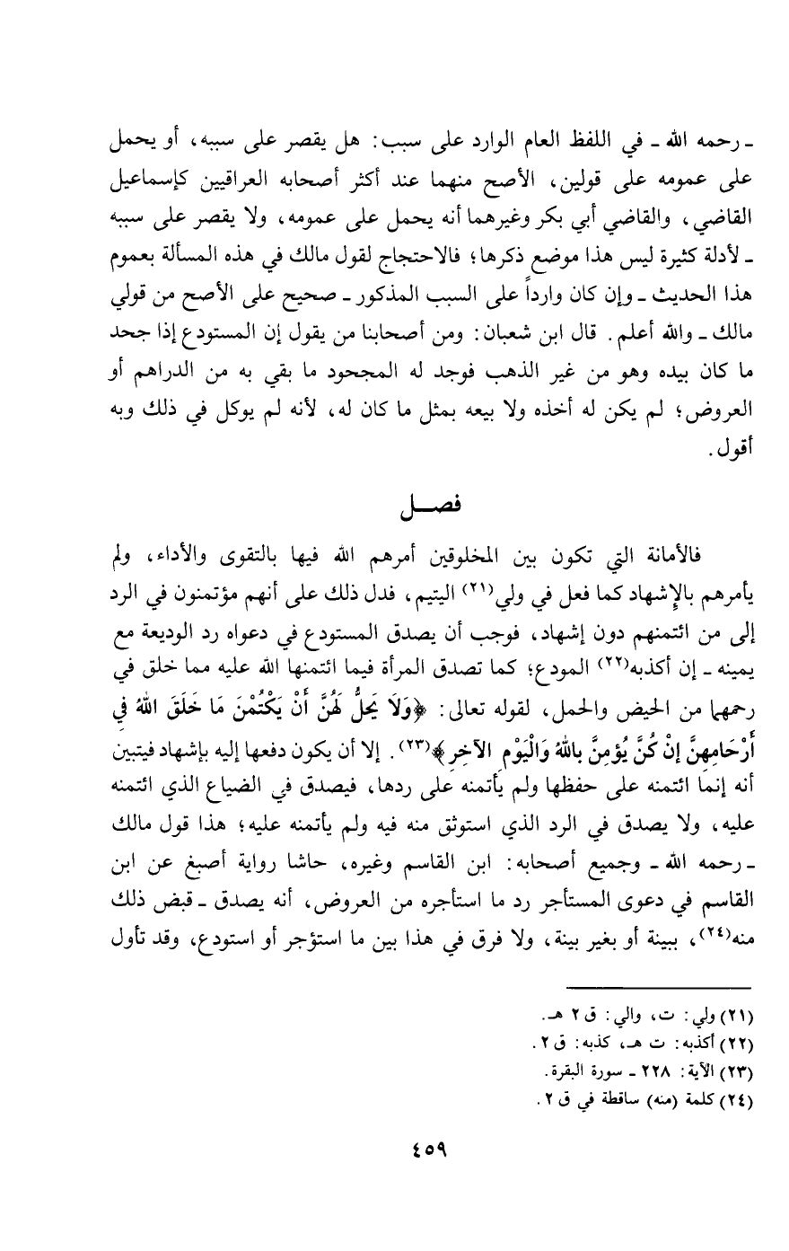 فالأمانة التي تكون بين المخلوقين أمرهم الله فيها بالتقوى والأداء، ولم يأمرهم بالإشهاد كما فعل في ولي اليتيم، فدل ذلك على أنهم مؤتمنون في الرد إلى من ائتمنهم دون إشهاد، فوجب أن يصدق المستودع في دعواه رد الوديعة مع يمينه - إن أكذبه المودع، كما تصدق المرأة فيما ائتمنها الله عليه مما خلق في رحمهما من الحيض والحمل، لِقَوْلِهِ تَعَالَى: {وَلا يَحِلُّ لَهُنَّ أَنْ يَكْتُمْنَ مَا خَلَقَ اللَّهُ فِي أَرْحَامِهِنَّ إِنْ كُنَّ يُؤْمِنَّ بِاللَّهِ وَالْيَوْمِ الآخِرِ} [البقرة: 228]. إلا أن يكون دفعها إليه بإشهاد فيتبين أنه إنما ائتمنه على حفظها ولم يأتمنه على ردها، فيصدق في الضياع الذي ائتمنه عليه، ولا يصدق في الرد الذي استوثق منه فيه ولم يأتمنه عليه، هذا قول مالك - رَحِمَهُ اللَّهُ - وجميع أصحابه: ابن القاسم وغيره، حاشا رواية أصبغ عن ابن القاسم في دعوى المستأجر رد ما استأجره من العروض، أنه يصدق - قبض ذلك منه، ببينة أو بغير بينة، ولا فرق في هذا بين ما استؤجر أو استودع، وقد تأول