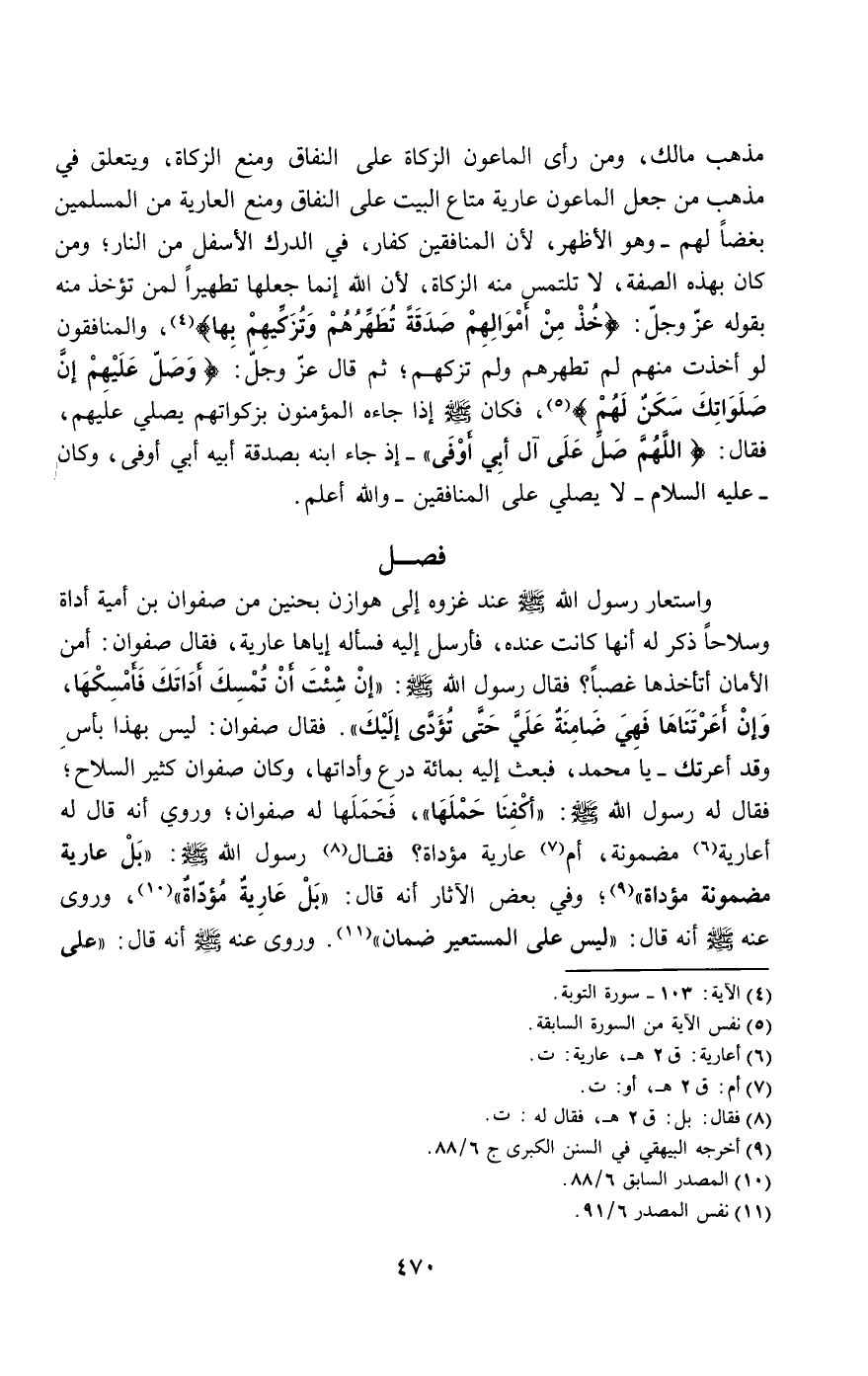 مذهب مالك، ومن رأى الماعون الزكاة على النفاق ومنع الزكاة، ويتعلق في مذهب من جعل الماعون عارية متاع البيت على النفاق ومنع العارية من المسلمين بغضا لهم - وهو الأظهر، لأن المنافقين كفار، في الدرك الأسفل من النار، ومن كان بهذه الصفة، لا تلتمس منه الزكاة، لأن الله إنما جعلها تطهيرا لمن تؤخذ منه بقوله عز وجل: {خُذْ مِنْ أَمْوَالِهِمْ صَدَقَةً تُطَهِّرُهُمْ وَتُزَكِّيهِمْ بِهَا} [التوبة: 103]، والمنافقون لو أخذت منهم لم تطهرهم ولم تزكهم؛ ثم قال عز وجل: {وَصَلِّ عَلَيْهِمْ إِنَّ صَلاتَكَ سَكَنٌ لَهُمْ} [التوبة: 103]، فكان - صَلَّى اللَّهُ عَلَيْهِ وَسَلَّمَ - إذا جاءه المؤمنون بزكواتهم يصلي عليهم، فقال: «اللهم صل على آل أبي أوفى» - إذ جاء ابنه بصدقة أبيه أبي أوفى، وكان - عَلَيْهِ السَّلَامُ - لا يصلي على المنافقين - والله أعلم.