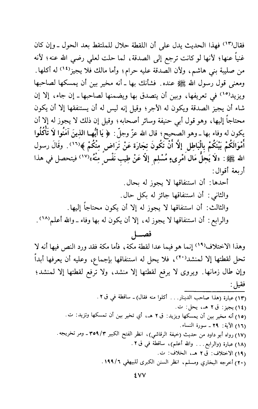 فقال فهذا الحديث يدل على أن اللقطة حلال للملتقط بعد الحول - وإن كان غنيا عنها؛ لأنها لو كانت ترجع إلى الصدقة، لما حلت لعلي - رَضِيَ اللَّهُ عَنْهُ -؛ لأنه من صليبة بني هاشم، ولأن الصدقة عليه حرام؛ وأما مالك فلا يجيز له أكلها. ومعنى قول رسول الله - صَلَّى اللَّهُ عَلَيْهِ وَسَلَّمَ - عنده. «فشأنك بها» - أنه مخير بين أن يمسكها لصاحبها ويزيد في تعريفها، وبين أن يتصدق بها ويضمنها لصاحبها - إن جاء، إلا إن شاء أن يجيز الصدقة ويكون له الأجرة، وقيل إنه ليس له أن يستنفقها إلا أن يكون محتاجا إليها، وهو قول أبي حنيفة وسائر أصحابه؛ وقيل إن ذلك لا يجوز له إلا أن يكون له وفاء بها - وهو الصحيح؛ قال الله عز وجل: {يَا أَيُّهَا الَّذِينَ آمَنُوا لا تَأْكُلُوا أَمْوَالَكُمْ بَيْنَكُمْ بِالْبَاطِلِ إِلا أَنْ تَكُونَ تِجَارَةً عَنْ تَرَاضٍ مِنْكُمْ} [النساء: 29]. وقال رسول الله - صَلَّى اللَّهُ عَلَيْهِ وَسَلَّمَ -: «لا يحل مال امرئ مسلم إلا عن طيب نفس منه» فيتحصل في هذا أربعة أقوال: