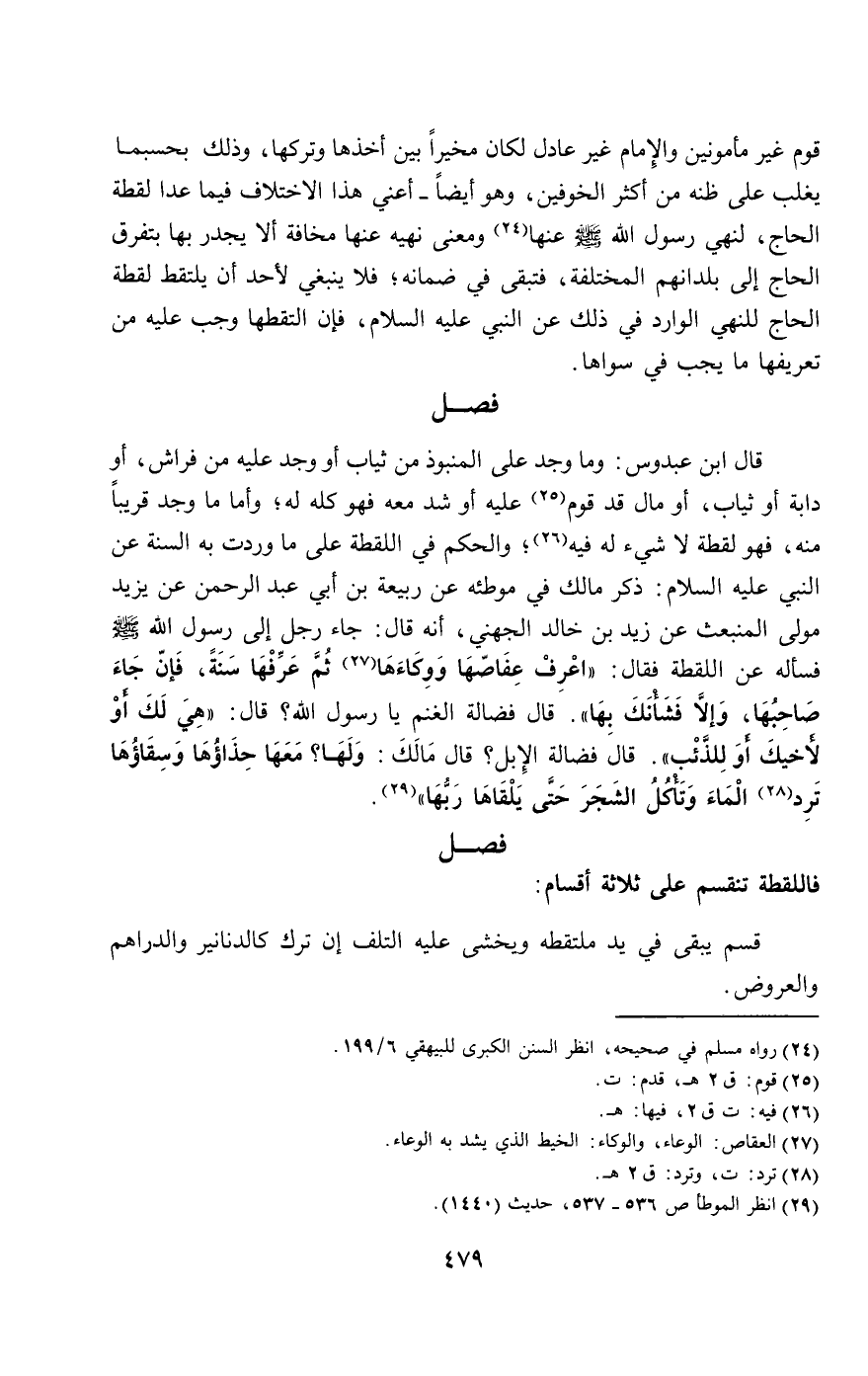 قال ابن عبدوس: وما وجد على المنبوذ من ثياب أو وجد عليه من فراش، أو دابة أو ثياب، أو مال قد قوم عليه أو شد معه فهو كله له؛ وأما ما وجد قريبا منه، فهو لقطة لا شيء له فيه؛ والحكم في اللقطة على ما وردت به السنة عن النبي - عَلَيْهِ السَّلَامُ -: ذكر مالك في موطئه عن ربيعة بن أبي عبد الرحمن عن يزيد مولى المنبعث عن زيد بن خالد الجهني، أنه قال: «جاء رجل إلى رسول الله - صَلَّى اللَّهُ عَلَيْهِ وَسَلَّمَ - فسأله عن اللقطة فقال: اعرف عفاصها ووكاءها ثم عرفها سنة، فإن جاء صاحبها، وإلا فشأنك بها. قال فضالة الغنم يا رسول الله؛ قال: هي لك أو لأخيك أو للذئب. قال: فضالة الإبل؟ قال مالك: ولها؛ معها حذاؤها وسقاؤها ترد الماء وتأكل الشجر حتى يلقاها ربها»