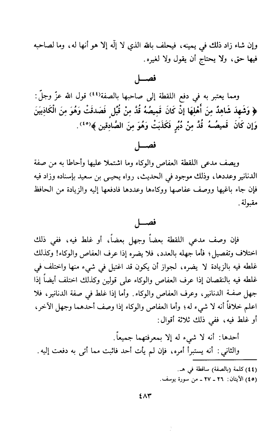 ومما يعتبر به في دفع اللقطة إلى صاحبها بالصفة قول الله عز وجل: {وَشَهِدَ شَاهِدٌ مِنْ أَهْلِهَا إِنْ كَانَ قَمِيصُهُ قُدَّ مِنْ قُبُلٍ فَصَدَقَتْ وَهُوَ مِنَ الْكَاذِبِينَ} [يوسف: 26] {وَإِنْ كَانَ قَمِيصُهُ قُدَّ مِنْ دُبُرٍ فَكَذَبَتْ وَهُوَ مِنَ الصَّادِقِينَ} [يوسف: 27].