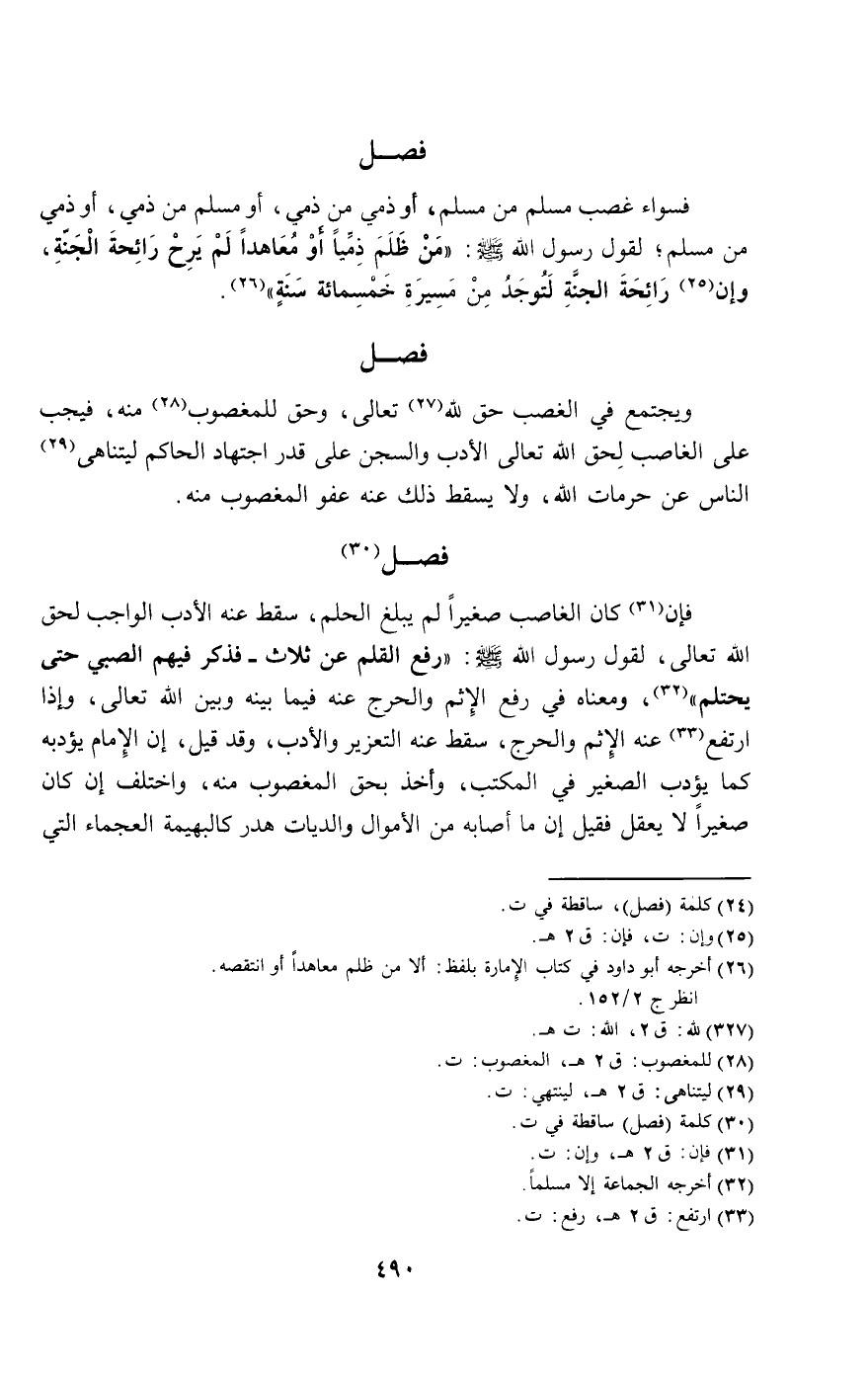فسواء غصب مسلم من مسلم، أو ذمي من ذمي، أو مسلم من ذمي، أو ذمي من مسلم، لقول رسول الله - صَلَّى اللَّهُ عَلَيْهِ وَسَلَّمَ -: «من ظلم ذميا أو معاهدا لم يرح رائحة الجنة، وإن رائحة الجنة لتوجد من مسيرة خمسمائة سنة».
