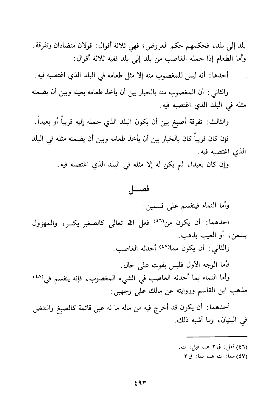 بلد إلى بلد، فحكمهم حكم العروض، فهي ثلاثة أقوال: قولان متضادان وتفرقة. وأما الطعام إذا حمله الغاصب من بلد إلى بلد ففيه ثلاثة أقوال: