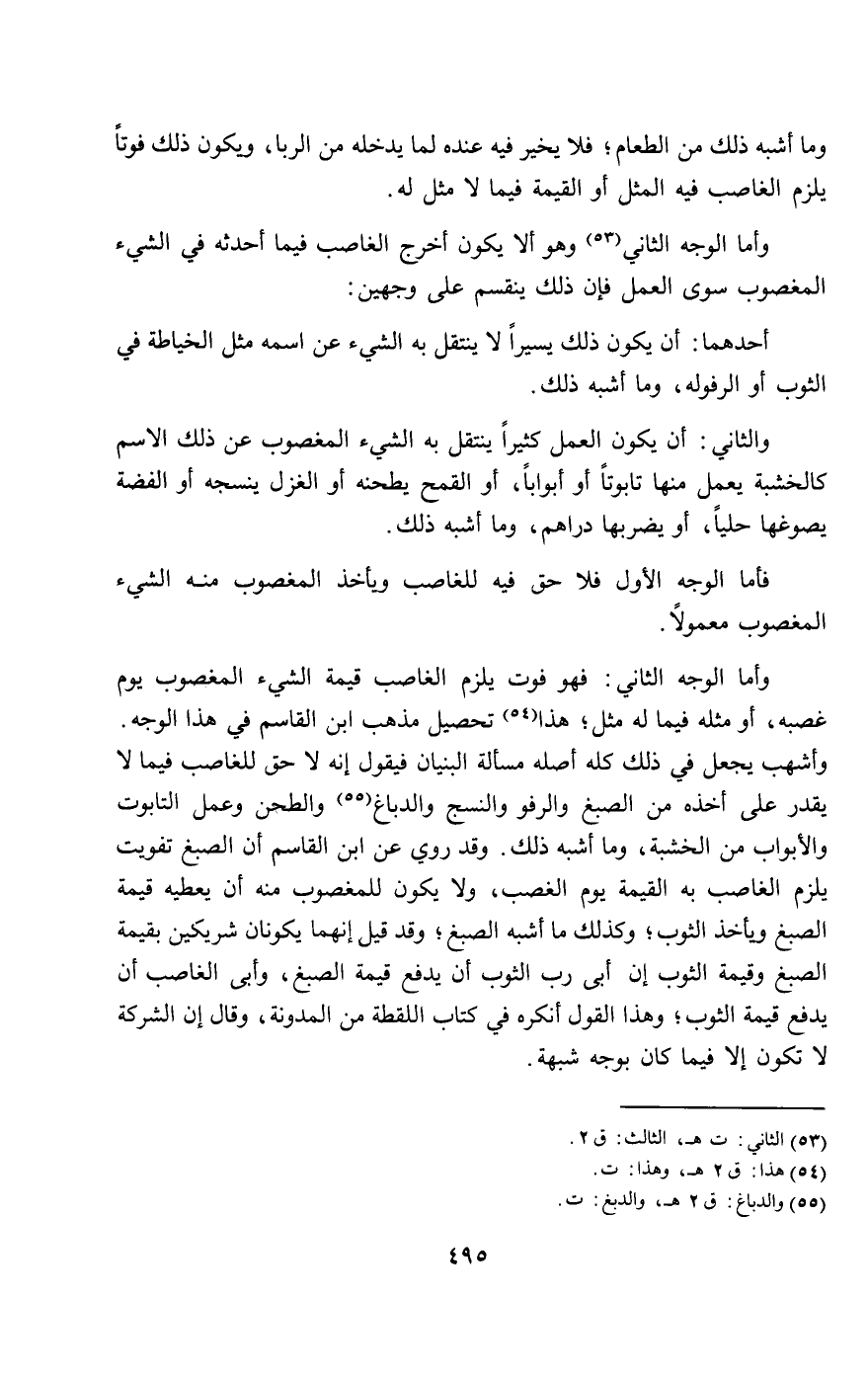 والثاني: أن يكون العمل كثيرا ينتقل به الشيء المغصوب عن ذلك الاسم كالخشبة يعمل منها تابوتا أو أبوابا، أو القمح يطحنه أو الغزل ينسجه أو الفضة يصوغها حليا، أو يضربها دراهم، وما أشبه ذلك.