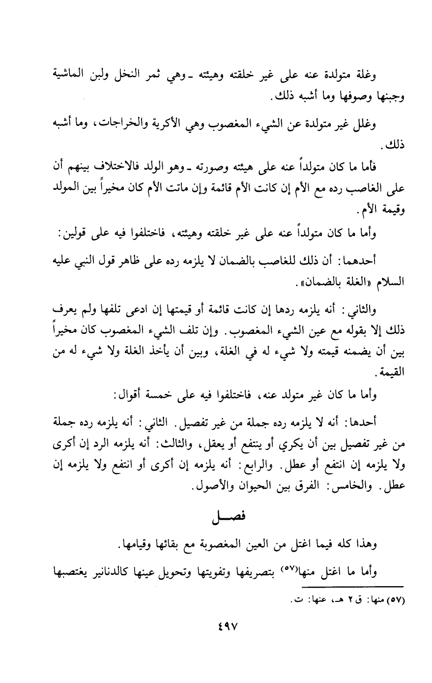 وغلة متولدة عنه على غير خلقته وهيئته - وهي ثمر النخل ولبن الماشية وجبنها وصوفها وما أشبه ذلك. وغلل غير متولدة عن الشيء المغصوب وهي الأكرية والخراجات، وما أشبه ذلك.