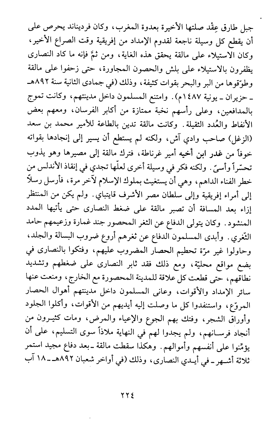جبل طارق عِقْد صلتها الأخيرة بعدوة المغرب، وكان فرديناند يحرص على أن يقطع كل وسيلة ناجعة لقدوم الإمداد من إفريقية وقت الصراع الأخير، وكان الاستيلاء على مالقة يحقق هذه الغاية، ومن ثمَّ فإنه ما كاد النصارى يظفرون بالاستيلاء على بلش والحصون المجاورة، حتى زحفوا على مالقة وطوّقوها من البر والبحر بقوات كثيفة، وذلك (في جمادى الثانية سنة 892 هـ - حزيران - يونية 1487 م). وامتنع المسلمون داخل مدينتهم، وكانت تموج بالمدافعين، وعلى رأسهم نخبة ممتازة من أكابر الفرسان، ومعهم بعض الأنفاط والعُدد الثقيلة. وكانت مالقة تدين بالطاعة للأمير محمد بن سعد (الزغل) صاحب وادي آش، ولكنه لم يستطع أن يسير إلى إنجادها بقواته خوفاً من غدر ابن أخيه أمير غرناطة، فترك مالقة إلى مصيرها وهو يذوب تحسّراً وأسىً. ولكنه فكر في وسيلة أخرى لعلّها تجدي في إنقاذ الأندلس من خطر الفناء الداهم، وهي أن يستغيث بملوك الإسلام لآخر مرة، فأرسل رسلاً إلى أمراء إفريقية وإلى سلطان مصر الأشرف قايتباي. ولم يكن من المنتظر إزاء بعد المسافة أن تصبر مالقة على ضغط النصارى حتى يأتيها المدد المنشود. وكان يتولى الدفاع عن الثغر المحصور جند غمارة وزعيمهم حامد الثّغري. وأبدى المسلمون في الدفاع عن ثغرهم أروع ضروب البسالة والجلد، وحاولوا غير مرّة تحطيم الحصار المضروب عليهم، وفتكوا بالنصارى في بضع مواقع محليّة، ومع ذلك فقد ثابر النصارى على ضغطهم وتشديد نطاقهم، حتى قطعت كل علاقة للمدينة المحصورة مع الخارج، ومنعت عنها سائر الإمداد والأقوات، وعانى المسلمون داخل مدينتهم أهوال الحصار المروّع، واستنفدوا كل ما وصلت إليه أيديهم من الأقوات، وأكلوا الجلود وأوراق الشجر، وفتك بهم الجوع والإعياء والمرض، ومات كثيرون من أنجاد فرسانهم، ولم يجدوا لهم في النهاية ملاذاً سوى التسليم، على أن يؤمِّنوا على أنفسهم وأموالهم. وهكذا سقطت مالقة - بعد دفاع مجيد استمر ثلاثة أشهر - في أيدي النصارى، وذلك (في أواخر شعبان 892 هـ - 18 آب