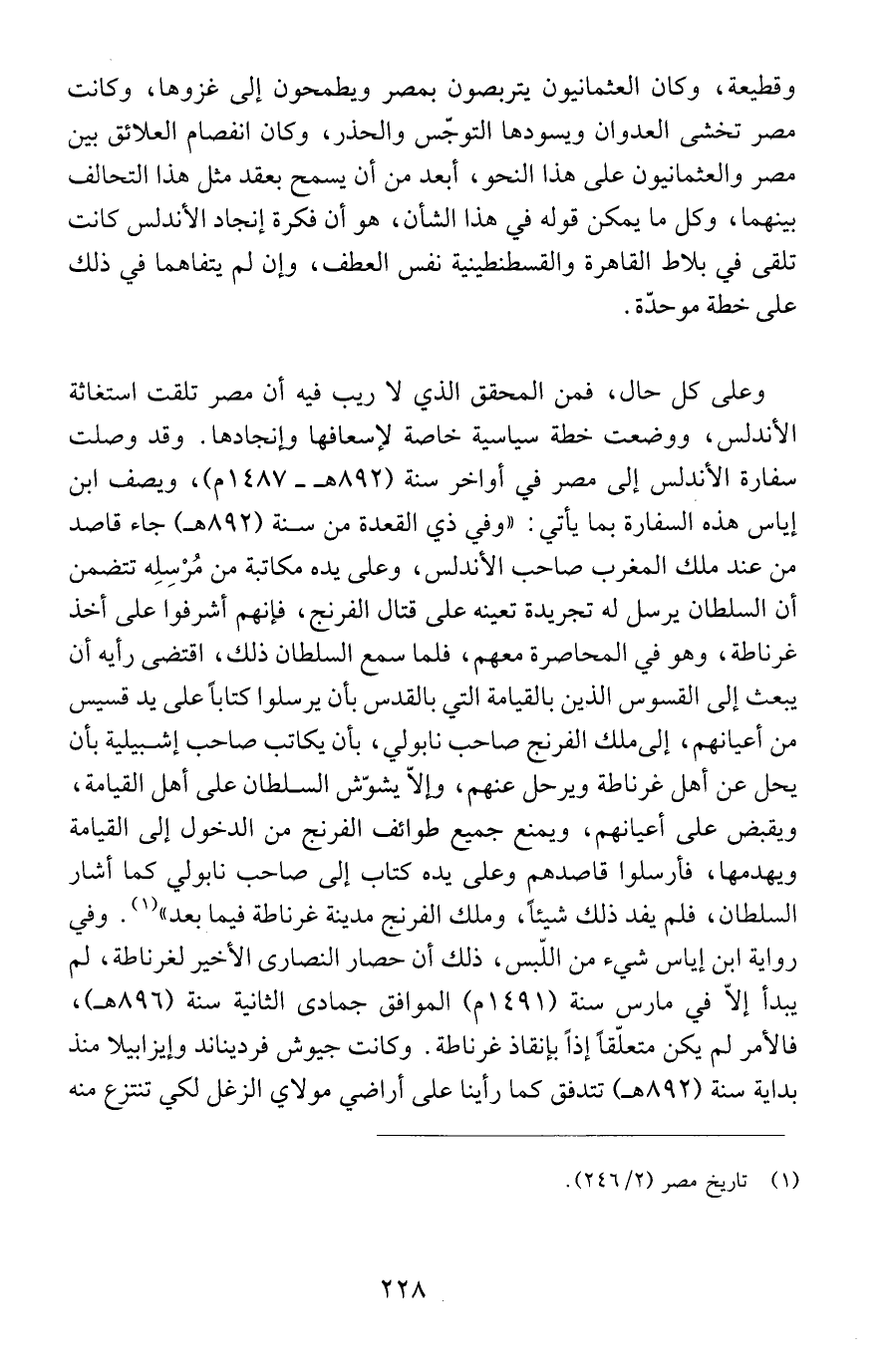 وقطيعة، وكان العثمانيون يتربصون بمصر ويطمحون إلى غزوها، وكانت مصر تخشى العدوان ويسودها التوجّس والحذر، وكان انفصام العلائق بين مصر والعثمانيين على هذا النحو، أبعد من أن يسمح بعقد مثل هذا التحالف بينهما، وكل ما يمكن قوله في هذا الشأن، هو أن فكرة إنجاد الأندلس كانت تلقى في بلاط القاهرة والقسطنطينية نفس العطف، وإن لم يتفاهما في ذلك على خطة موحدّة.