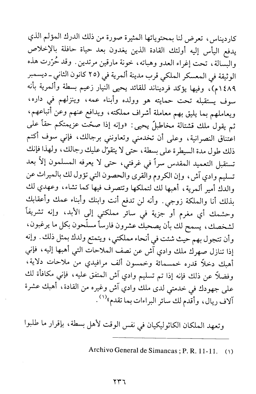 كارديناس، تعرض لنا بمحتوياتها المثيرة صورة من ذلك الدرك المؤلم الذي يدفع اليأس إليه أولئك القادة الذين يغدون بعد حياة حافلة بالإخلاص والبسالة، تحت إغراء العدو وهباته، خونة مارقين مرتدين. وقد حُرّرت هذه الوثيقة في المعسكر الملكي قرب مدينة ألمرية في (25 كانون الثاني - ديسمبر 1489 م)، وفيها يؤكد فرديناند للقائد يحيى النيار زعيم بسطة وألمرية بأنه سوف يستقبله تحت حمايته هو وولده وأبناء عمه، وينزلهم في داره، ويعاملهم بما يليق بهم معاملة أشراف مملكته، ويدافع عنهم وعن أتباعهم، ثم يقول ملك قشتالة مخاطباً يحيى: "وإنه إذا صحّت عزيمتكم حقاً على اعتناق النصرانية، وعلى أن تخدمني وتعاونني برجالك، فإني سوف أكتم ذلك طول مدة السيطرة على بسطة، حتى لا يتقوّل عليك رجالك، ولهذا فإنك تستقبل التعميد المقدس سراً في غرفتي، حتى لا يعرفه المسلمون إلاّ بعد تسليم وادي آش، وإن الكروم والقرى والحصون التي تؤول لك بالميراث عن والدك أمير ألمرية، أهبها لك لتملكها وتتصرف فيها كما تشاء، وعهدي لك بذلك أنا والملكة زوجي. وأنه لن تدفع أنت وابنك وأبناء عمك وأعقابك وحشمك أي مغرم أو جزية في سائر مملكتي إلى الأبد، وإنه تشريفاً لشخصك، يُسمح لك بأن يصحبك عشرون فارساً مسلّحون بكل ما يرغبون، وأن تتجول بهم حيث شئت في أنحاء مملكتي، ويتمتع ولدك بمثل ذلك. وإنه إذا تنازل صهرك ملك وادي آش عن نصف الملاحات التي أهبها إليه، فإني أهبك دخلاً قدره خمسمائة وخمسون ألف مرافيدي من ملاحات دلاية، وفضلاً عن ذلك فإنه إذا تم تسليم وادي آش المتفق عليه، فإني مكافأة لك على جهودك في خدمتي لدى ملك وادي آش وغيره من القادة، أهبك عشرة آلاف ريال، وأقدم لك سائر البراءات بما تقدم" (1).