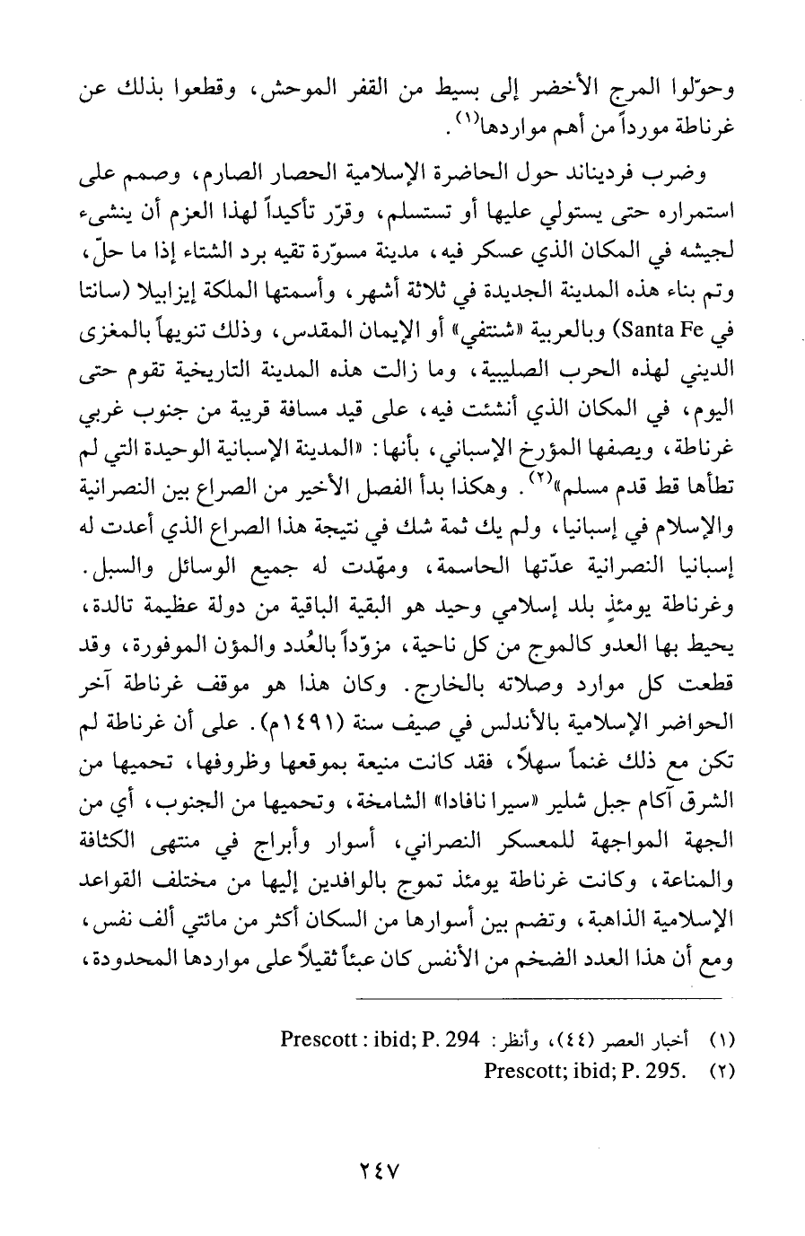 وضرب فرديناند حول الحاضرة الإسلامية الحصار الصارم، وصمم على استمراره حتى يستولي عليها أو تستسلم، وقرّر تأكيداً لهذا العزم أن ينشئ لجيشه في المكان الذي عسكر فيه، مدينة مسوّرة تقيه برد الشتاء إذا ما حلّ، وتم بناء هذه المدينة الجديدة في ثلاثة أشهر، وأسمتها الملكة إيزابيلا (سانتا في Santa Fe) وبالعربية "شنتفي" أو الإيمان المقدس، وذلك تنويهاً بالمغزى الديني لهذه الحرب الصليبية، وما زالت هذه المدينة التاريخية تقوم حتى اليوم، في المكان الذي أنشئت فيه، على قيد مسافة قريبة من جنوب غربي غرناطة، ويصفها المؤرخ الإسباني، بأنها: "المدينة الإسبانية الوحيدة التي لم تطأها قط قدم مسلم" (2). وهكذا بدأ الفصل الأخير من الصراع بين النصرانية والإسلام في إسبانيا، ولم يك ثمة شك في نتيجة هذا الصراع الذي أعدت له إسبانيا النصرانية عدّتها الحاسمة، ومهّدت له جميع الوسائل والسبل. وغرناطة يومئذٍ بلد إسلامي وحيد هو البقية الباقية من دولة عظيمة تالدة، يحيط بها العدو كالموج من كل ناحية، مزوّداً بالعدد والمؤن الموفورة، وقد قطعت كل موارده وصلاته بالخارج. وكان هذا هو موقف غرناطة آخر الحواضر الإسلامية بالأندلس في صيف سنة (1491 م). على أن غرناطة لم تكن مع ذلك غنماً سهلاً، فقد كانت منيعة بموقعها وظروفها، تحميها من الشرق آكام جبل شلير "سيرا نافادا" الشامخة، وتحميها من الجنوب، أي من الجهة المواجهة للمعسكر النصراني، أسوار وأبراج في منتهى الكثافة والمناعة، وكانت غرناطة يومئذ تموج بالوافدين إليها من مختلف القواعد الإسلامية الذاهبة، وتضم بين أسوارها من السكان أكثر من مائتي ألف نفس، ومع أن هذا العدد الضخم من الأنفس كان عبئاً ثقيلاً على مواردها المحدودة،