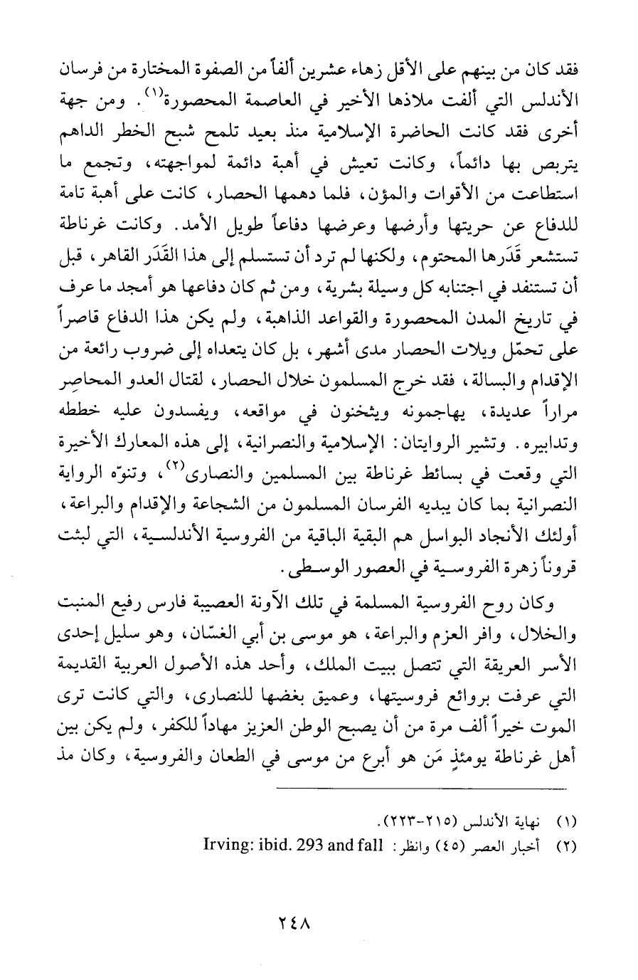 فقد كان من بينهم على الأقل زهاء عشرين ألفاً من الصفوة المختارة من فرسان الأندلس التي ألفت ملاذها الأخير في العاصمة المحصورة (1). ومن جهة أخرى فقد كانت الحاضرة الإسلامية منذ بعيد تلمح شبح الخطر الداهم يتربص بها دائماً، وكانت تعيش في أهبة دائمة لمواجهته، وتجمع ما استطاعت من الأقوات والمؤن، فلما دهمها الحصار، كانت على أهبة تامة للدفاع عن حريتها وأرضها وعرضها دفاعاً طويل الأمد. وكانت غرناطة تستشعر قَدَرها المحتوم، ولكنها لم ترد أن تستسلم إلى هذا القَدَر القاهر، قبل أن تستنفد في اجتنابه كل وسيلة بشرية، ومن ثم كان دفاعها هو أمجد ما عرف في تاريخ المدن المحصورة والقواعد الذاهبة، ولم يكن هذا الدفاع قاصراً على تحمّل ويلات الحصار مدى أشهر، بل كان يتعداه إلى ضروب رائعة من الإقدام والبسالة، فقد خرج المسلمون خلال الحصار، لقتال العدو المحاصِر مراراً عديدة، يهاجمونه ويثخنون في مواقعه، ويفسدون عليه خططه وتدابيره. وتشير الروايتان: الإسلامية والنصرانية، إلى هذه المعارك الأخيرة التي وقعت في بسائط غرناطة بين المسلمين والنصارى (2)، وتنوّه الرواية النصرانية بما كان يبديه الفرسان المسلمون من الشجاعة والإقدام والبراعة، أولئك الأنجاد البواسل هم البقية الباقية من الفروسية الأندلسية، التي لبثت قروناً زهرة الفروسية في العصور الوسطى.