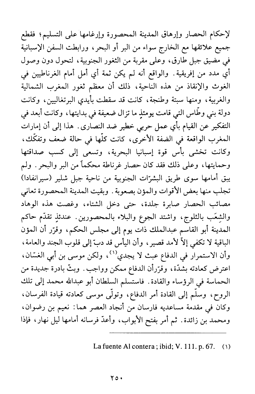لإحكام الحصار وإرهاق المدينة المحصورة وإرغامها على التسليم؛ فقطع جميع علائقها مع الخارج سواء من البر أو البحر، ورابطت السفن الإسبانية في مضيق جبل طارق، وعلى مقربة من الثغور الجنوبية، لتحول دون وصول أي مدد من إفريقية. والواقع أنه لم يكن ثمة أي أمل أمام الغرناطيين في الغوث والإنقاذ من هذه الناحية، ذلك أن معظم ثغور المغرب الشمالية والغربية، ومنها سبتة وطنجة، كانت قد سقطت بأيدي البرتغاليين، وكانت دولة بني وطّاس التي قامت يومئذٍ ما تزال ضعيفة في بدايتها، وكانت أبعد في التفكير عن القيام بأي عمل حربي خطير ضد النصارى. هذا إلى أن إمارات المغرب الواقعة في الضفة الأخرى، كانت كلّها في حالة ضعف وتفكّك، وكانت تخشى بأس قوة إسبانيا البحرية، وتسعى إلى كسب صداقتها وحمايتها، وعلى ذلك فقد كان حصار غرناطة محكماً من البر والبحر. ولم يبق أمامها سوى طريق البشرّات الجنوبية من ناحية جبل شلير (سيرانفادا) تجلب منها بعض الأقوات والمؤن بصعوبة. وبقيت المدينة المحصورة تعاني مصائب الحصار صابرة جلدة، حتى دخل الشتاء، وغصت هذه الوهاد والشِعَب بالثلوج، واشتد الجوع والبلاء بالمحصورين. عندئذ تقدّم حاكم المدينة أبو القاسم عبد الملك ذات يوم إلى مجلس الحكم، وقرّر أن المؤن الباقية لا تكفي إلاّ لأمد قصير، وأن اليأس قد دبّ إلى قلوب الجند والعامة، وأن الاستمرار في الدفاع عبث لا يجدي (1)، ولكن موسى بن أبي الغسّان، اعترض كعادته بشدّة، وقرّر أن الدفاع ممكن وواجب. وبثّ بادرة جديدة من الحماسة في الرؤساء والقادة. فاستسلم السلطان أبو عبد الله محمد إلى تلك الروح، وسلّم إلى القادة أمر الدفاع، وتولّى موسى كعادته قيادة الفرسان، وكان في مقدمة مساعديه فارسان من أنجاد العصر هما: نعيم بن رضوان، ومحمد بن زائدة. ثم أمر بفتح الأبواب، وأعدّ فرسانه أمامها ليل نهار، فإذا