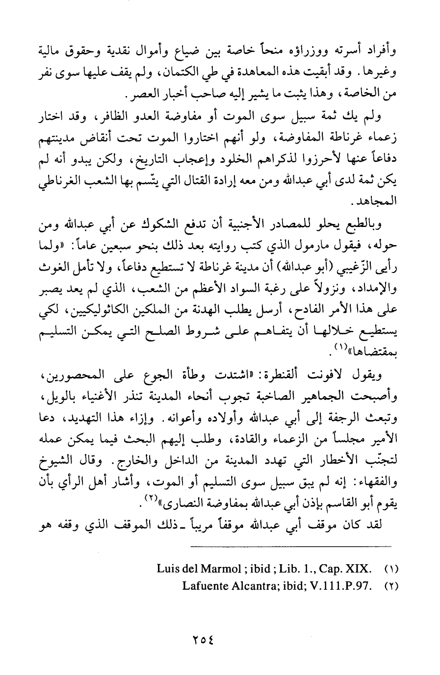 ولم يك ثمة سبيل سوى الموت أو مفاوضة العدو الظافر، وقد اختار زعماء غرناطة المفاوضة، ولو أنهم اختاروا الموت تحت أنقاض مدينتهم دفاعاً عنها لأحرزوا لذكراهم الخلود وإعجاب التاريخ، ولكن يبدو أنه لم يكن ثمة لدى أبي عبد الله ومن معه إرادة القتال التي يتّسم بها الشعب الغرناطي المجاهد.