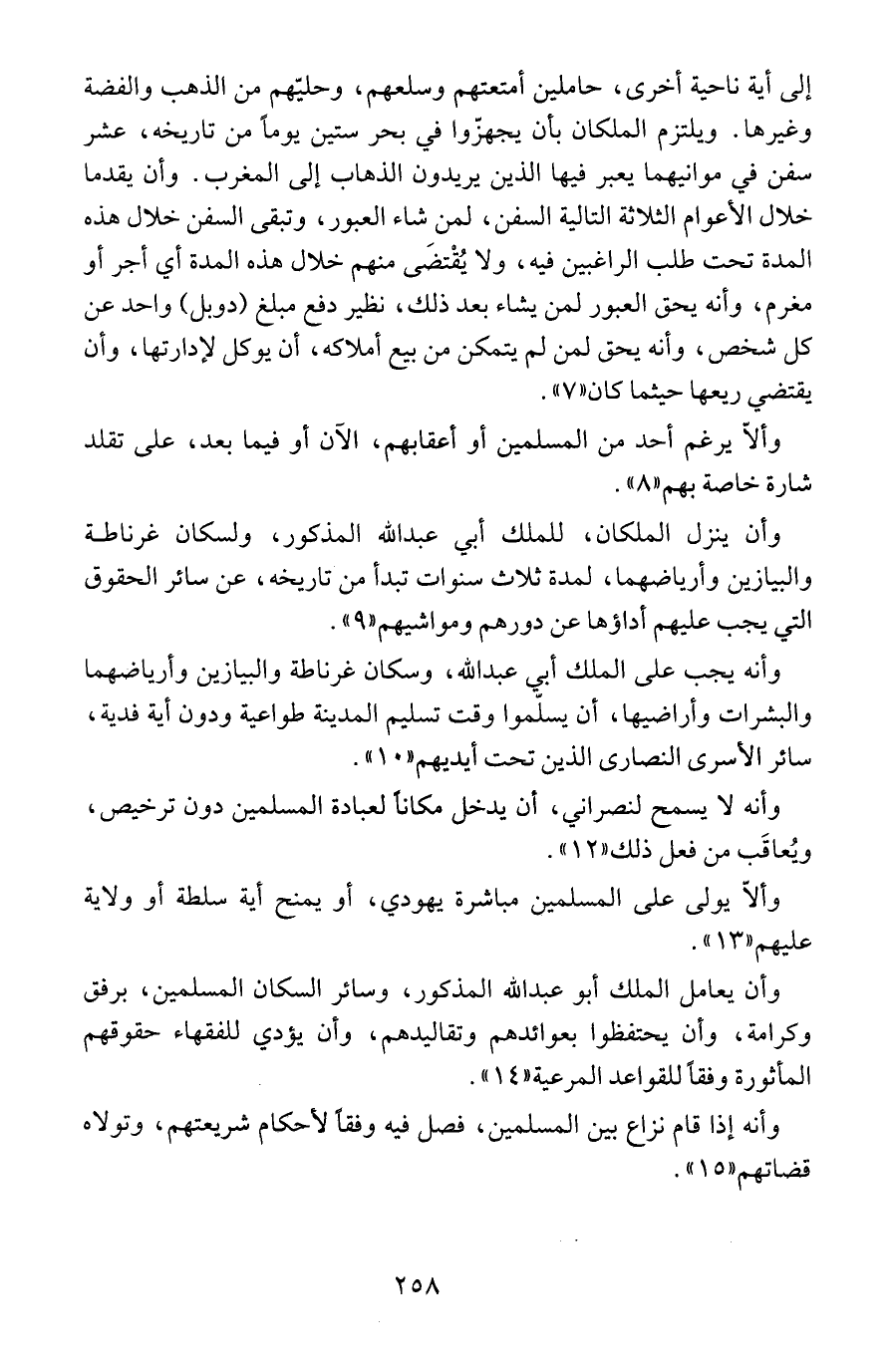 وأن يعامل الملك أبو عبد الله المذكور، وسائر السكان المسلمين، برفق وكرامة، وأن يحتفظوا بعوائدهم وتقاليدهم، وأن يؤدي للفقهاء حقوقهم المأثورة وفقاً للقواعد المرعية "14".