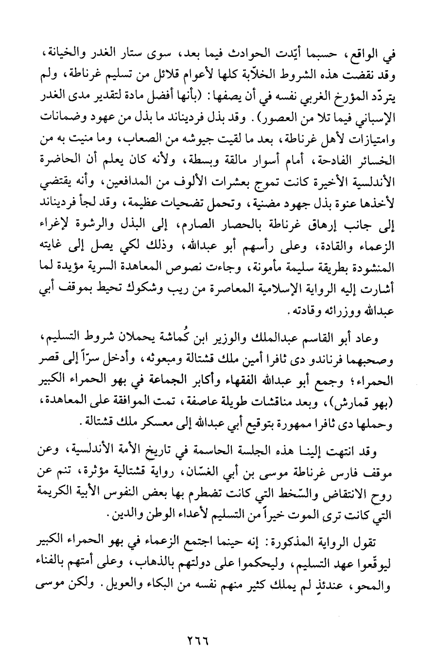 في الواقع، حسبما أيّدت الحوادث فيما بعد، سوى ستار الغدر والخيانة، وقد نقضت هذه الشروط الخلاّبة كلها لأعوام قلائل من تسليم غرناطة، ولم يتردد المؤرخ الغربي نفسه في أن يصفها: (بأنها أفضل مادة لتقدير مدى الغدر الإسباني فيما تلا من العصور). وقد بذل فرديناند ما بذل من عهود وضمانات وامتيازات لأهل غرناطة، بعد ما لقيت جيوشه من الصعاب، وما منيت به من الخسائر الفادحة، أمام أسوار مالقة وبسطة، ولأنه كان يعلم أن الحاضرة الأندلسية الأخيرة كانت تموج بعشرات الألوف من المدافعين، وأنه يقتضي لأخذها عنوة بذل جهود مضنية، وتحمل تضحيات عظيمة، وقد لجأ فرديناند إلى جانب إرهاق غرناطة بالحصار الصارم، إلى البذل والرشوة لإغراء الزعماء والقادة، وعلى رأسهم أبو عبد الله، وذلك لكي يصل إلى غايته المنشودة بطريقة سليمة مأمونة، وجاءت نصوص المعاهدة السرية مؤيدة لما أشارت إليه الرواية الإسلامية المعاصرة من ريب وشكوك تحيط بموقف أبي عبد الله ووزرائه وقادته.