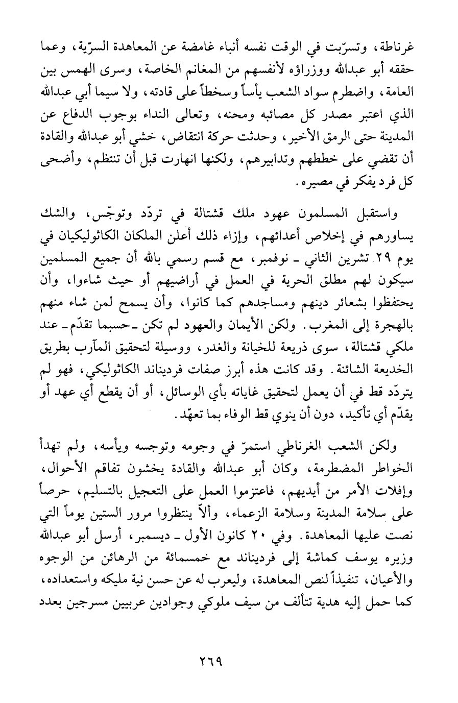 غرناطة، وتسرّبت في الوقت نفسه أنباء غامضة عن المعاهدة السرّية، وعما حققه أبو عبد الله ووزراؤه لأنفسهم من المغانم الخاصة، وسرى الهمس بين العامة، واضطرم سواد الشعب يأساً وسخطاً على قادته، ولا سيما أبي عبد الله الذي اعتبر مصدر كل مصائبه ومحنه، وتعالى النداء بوجوب الدفاع عن المدينة حتى الرمق الأخير، وحدثت حركة انتقاض، خشي أبو عبد الله والقادة أن تقضي على خططهم وتدابيرهم، ولكنها انهارت قبل أن تنتظم، وأضحى كل فرد يفكر في مصيره.
