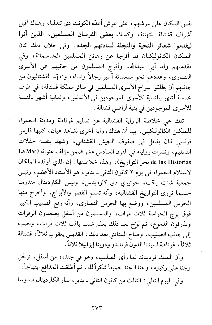وأن الملك فرديناند لما رأى الصليب، وهو في جنده، من أسفل، ترجّل وجثا على ركبتيه، وجثا الجند جميعاً شكراً لله، ثم أطلقت المدافع ابتهاجاً.