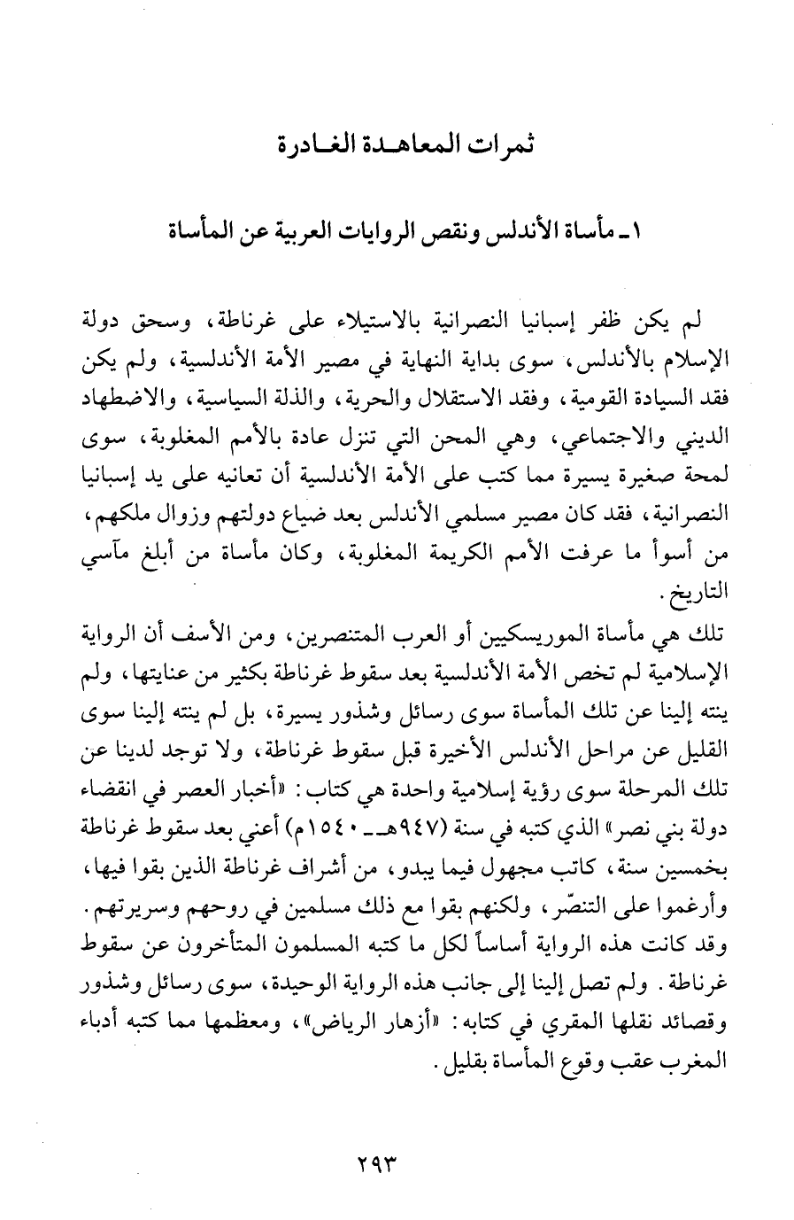 تلك هي مأساة الموريسكيين أو العرب المتنصرين، ومن الأسف أن الرواية الإسلامية لم تخص الأمة الأندلسية بعد سقوط غرناطة بكثير من عنايتها، ولم ينته إلينا عن تلك المأساة سوى رسائل وشذور يسيرة، بل لم ينته إلينا سوى القليل عن مراحل الأندلس الأخيرة قبل سقوط غرناطة، ولا توجد لدينا عن تلك المرحلة سوى رؤية إسلامية واحدة هي كتاب: "أخبار العصر في انقضاء دولة بني نصر" الذي كتبه في سنة (947 هـ - 1540 م) أعني بعد سقوط غرناطة بخمسين سنة، كاتب مجهول فيما يبدو، من أشراف غرناطة الذين بقوا فيها، وأُرغموا على التنصّر، ولكنهم بقوا مع ذلك مسلمين في روحهم وسريرتهم. وقد كانت هذه الرواية أساساً لكل ما كتبه المسلمون المتأخرون عن سقوط غرناطة. ولم تصل إلينا إلى جانب هذه الرواية الوحيدة، سوى رسائل وشذور وقصائد نقلها المقري في كتابه: "أزهار الرياض"، ومعظمها مما كتبه أدباء المغرب عقب وقوع المأساة بقليل.