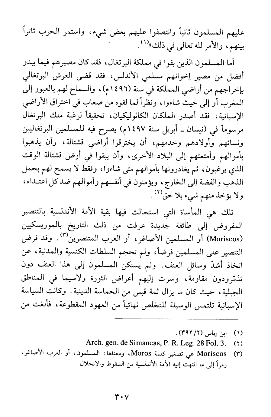 (3) Moriscos هي تصغير كلمة Moros، ومعناها: المسلمون، أو العرب الأصاغر، رمزاً إلى ما انتهت إليه الأمة الأندلسية من السقوط والانحلال.
