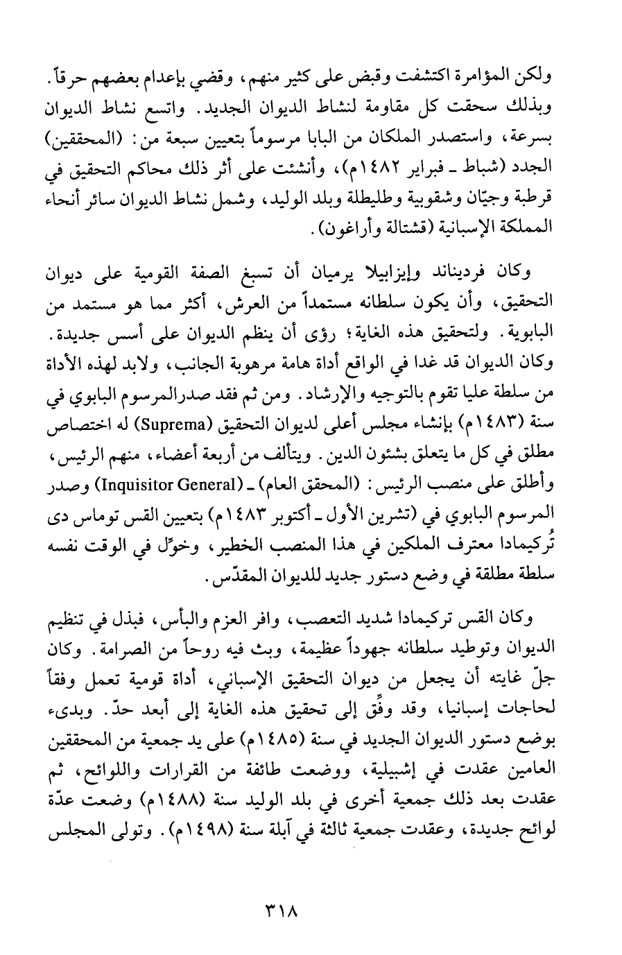 وكان فرديناند وإيزابيلا يرميان أن تسبغ الصفة القومية على ديوان التحقيق، وأن يكون سلطانه مستمداً من العرش، أكثر مما هو مستمد من البابوية. ولتحقيق هذه الغاية؛ رُؤى أن ينظم الديوان على أسس جديدة. وكان الديوان قد غدا في الواقع أداة هامة مرهوبة الجانب، ولابد لهذه الأداة من سلطة عليا تقوم بالتوجيه والإرشاد. ومن ثم فقد صدر المرسوم البابوي في سنة (1483 م) بإنشاء مجلس أعلى لديوان التحقيق ( Suprema) له اختصاص مطلق في كل ما يتعلق بشئون الدين. ويتألف من أربعة أعضاء، منهم الرئيس، وأطلق على منصب الرئيس: (المحقق العام) - ( Inquisitor General) وصدر المرسوم البابوي في (تشرين الأول - أكتوبر 1483 م) بتعيين القس توماس دى تُركيمادا معترف الملكين في هذا المنصب الخطير، وخوِّل في الوقت نفسه سلطة مطلقة في وضع دستور جديد للديوان المقدّس.