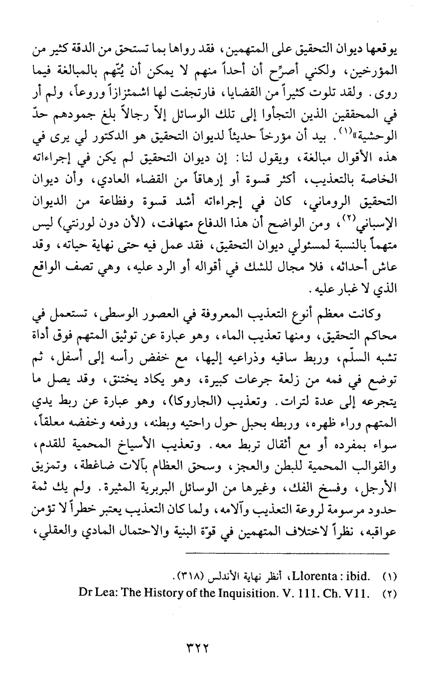 يوقعها ديوان التحقيق على المتهمين، فقد رواها بما تستحق من الدقة كثير من المؤرخين، ولكني أصرِّح أن أحداً منهم لا يمكن أن يُتّهم بالمبالغة فيما روى. ولقد تلوت كثيراً من القضايا، فارتجفت لها اشمئزازاً وروعاً، ولم أر في المحققين الذين التجأوا إلى تلك الوسائل إلاّ رجالاً بلغ جمودهم حدّ الوحشية" (1). بيد أن مؤرخاً حديثاً لديوان التحقيق هو الدكتور لي يرى في هذه الأقوال مبالغة، ويقول لنا: إن ديوان التحقيق لم يكن في إجراءاته الخاصة بالتعذيب، أكثر قسوة أو إرهاقاً من القضاء العادي، وأن ديوان التحقيق الروماني، كان في إجراءاته أشد قسوة وفظاعة من الديوان الإسباني (2)، ومن الواضح أن هذا الدفاع متهافت، (لأن دون لورنتي) ليس متهماً بالنسبة لمسئولي ديوان التحقيق، فقد عمل فيه حتى نهاية حياته، وقد عاش أحداثه، فلا مجال للشك في أقواله أو الرد عليه، وهي تصف الواقع الذي لا غبار عليه.