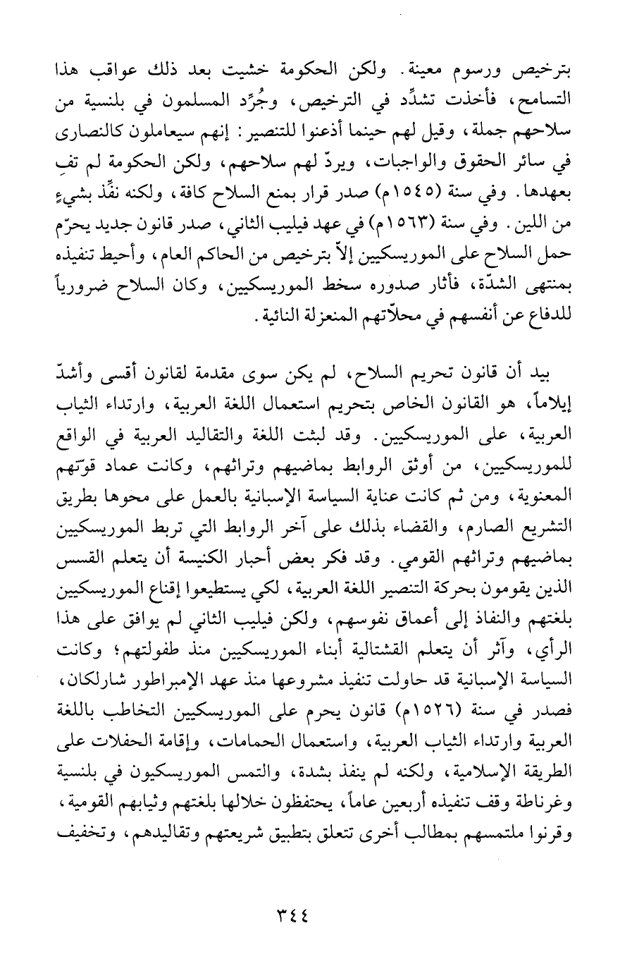 بترخيص ورسوم معينة. ولكن الحكومة خشيت بعد ذلك عواقب هذا التسامح، فأخذت تشدِّد في الترخيص، وجُرِّد المسلمون في بلنسية من سلاحهم جملة، وقيل لهم حينما أذعنوا للتنصير: إنهم سيعاملون كالنصارى في سائر الحقوق والواجبات، ويردّ لهم سلاحهم، ولكن الحكومة لم تفِ بعهدها. وفي سنة (1545 م) صدر قرار بمنع السلاح كافة، ولكنه نفِّذ بشيءٍ من اللين. وفي سنة (1563 م) في عهد فيليب الثاني، صدر قانون جديد يحرّم حمل السلاح على الموريسكيين إلاّ بترخيص من الحاكم العام، وأحيط تنفيذه بمنتهى الشدّة، فأثار صدوره سخط الموريسكيين، وكان السلاح ضرورياً للدفاع عن أنفسهم في محلاّتهم المنعزلة النائية.