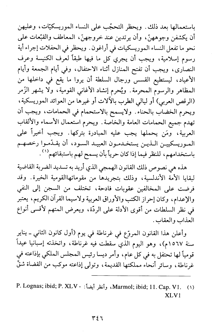 باستعمالها بعد ذلك. ويحظر التحجّب على النساء الموريسكيّات، وعليهن أن يكشفن وجوههنّ، وأن يرتدين عند خروجهنّ، المعاطف والقبّعات على نحو ما تفعل النساء الموريسكيات في أراغون. ويحظر في الحفلات إجراء أية رسوم إسلامية، ويجب أن يجري كل ما فيها طبقاً لعرف الكنيسة وعرف النصارى، ويجب أن تفتح المنازل أثناء الاحتفال، وفي أيام الجمعة وأيام الأعياد، ليستطيع القسس ورجال السلطة أن يروا ما يقع في داخلها من المظاهر والرسوم المحرمة. ويُحرم إنشاد الأغاني القومية، ولا يشهر الزّمر (الرقص العربي) أو ليالي الطرب بالآلات أو غيرها من العوائد الموريسكية، ويحرم الخضاب بالحناء. ولا يسمح بالاستحمام في الحمامات، ويجب أن تهدم جميع الحمامات العامة والخاصة. ويحرم استعمال الأسماء والألقاب العربية، ومَن يحملها يجب عليه المبادرة بتركها. ويجب أخيراً على الموريسكيين الذين يستخدمون العبيد السود، أن يقدّموا رخصهم باستخدامهم، للنظر فيما إذا كان حرياً بأن يسمح لهم باستبقائهم (1).