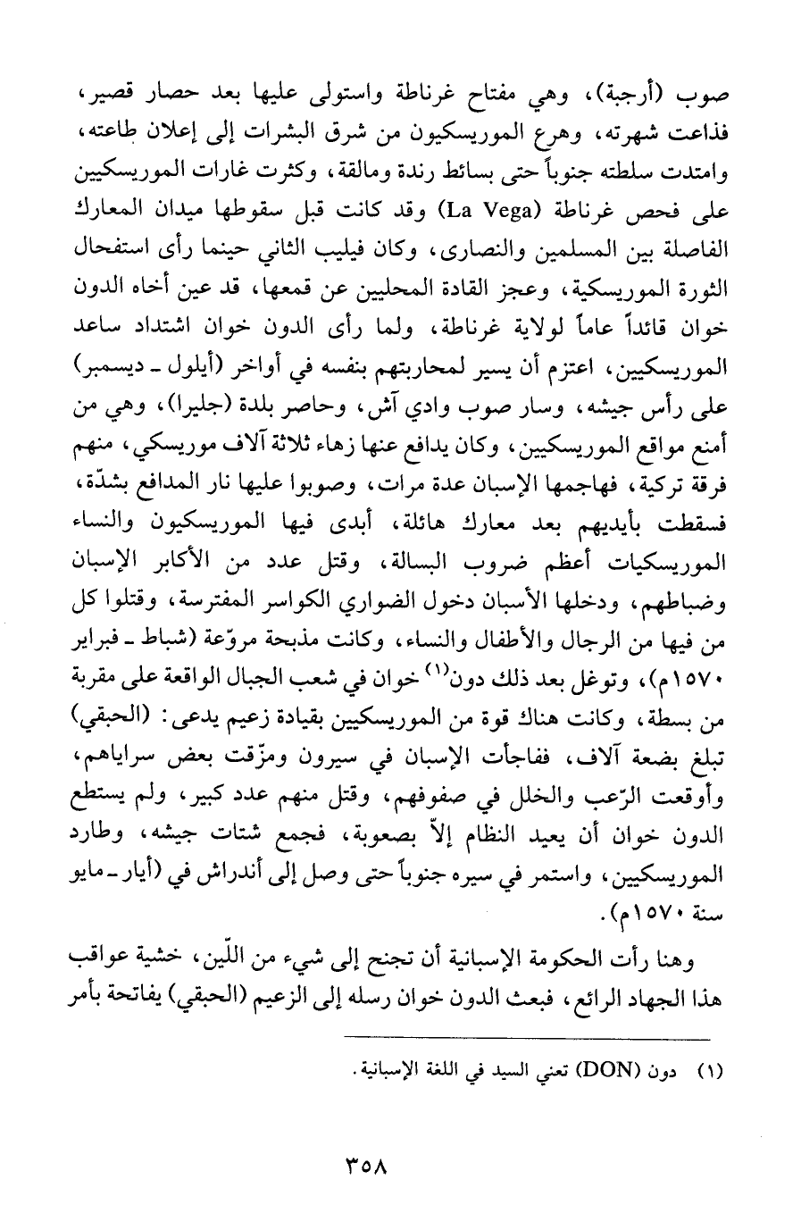 صوب (أرجبة)، وهي مفتاح غرناطة واستولى عليها بعد حصار قصير، فذاعت شهرته، وهرع الموريسكيون من شرق البشرات إلى إعلان طاعته، وامتدت سلطته جنوباً حتى بسائط رندة ومالقة، وكثرت غارات الموريسكيين على فحص غرناطة ( La Vega) وقد كانت قبل سقوطها ميدان المعارك الفاصلة بين المسلمين والنصارى، وكان فيليب الثاني حينما رأى استفحال الثورة الموريسكية، وعجز القادة المحليين عن قمعها، قد عين أخاه الدون خوان قائداً عاماً لولاية غرناطة، ولما رأى الدون خوان اشتداد ساعد الموريسكيين، اعتزم أن يسير لمحاربتهم بنفسه في أواخر (أيلول - ديسمبر) على رأس جيشه، وسار صوب وادي آش، وحاصر بلدة (جليرا)، وهي من أمنع مواقع الموريسكيين، وكان يدافع عنها زهاء ثلاثة آلاف موريسكي، منهم فرقة تركية، فهاجمها الإسبان عدة مرات، وصوبوا عليها نار المدافع بشدّة، فسقطت بأيديهم بعد معارك هائلة، أبدى فيها الموريسكيون والنساء الموريسكيات أعظم ضروب البسالة، وقتل عدد من الأكابر الإسبان وضباطهم، ودخلها الأسبان دخول الضواري الكواسر المفترسة، وقتلوا كل من فيها من الرجال والأطفال والنساء، وكانت مذبحة مروّعة (شباط - فبراير 1570 م)، وتوغل بعد ذلك دون (1) خوان في شعب الجبال الواقعة على مقربة من بسطة، وكانت هناك قوة من الموريسكيين بقيادة زعيم يدعى: (الحبقي) تبلغ بضعة آلاف، ففاجأت الإسبان في سيرون ومزّقت بعض سراياهم، وأوقعت الرّعب والخلل في صفوفهم، وقتل منهم عدد كبير، ولم يستطع الدون خوان أن يعيد النظام إلاّ بصعوبة، فجمع شتات جيشه، وطارد الموريسكيين، واستمر في سيره جنوباً حتى وصل إلى أندراش في (أيار - مايو سنة 1570 م).