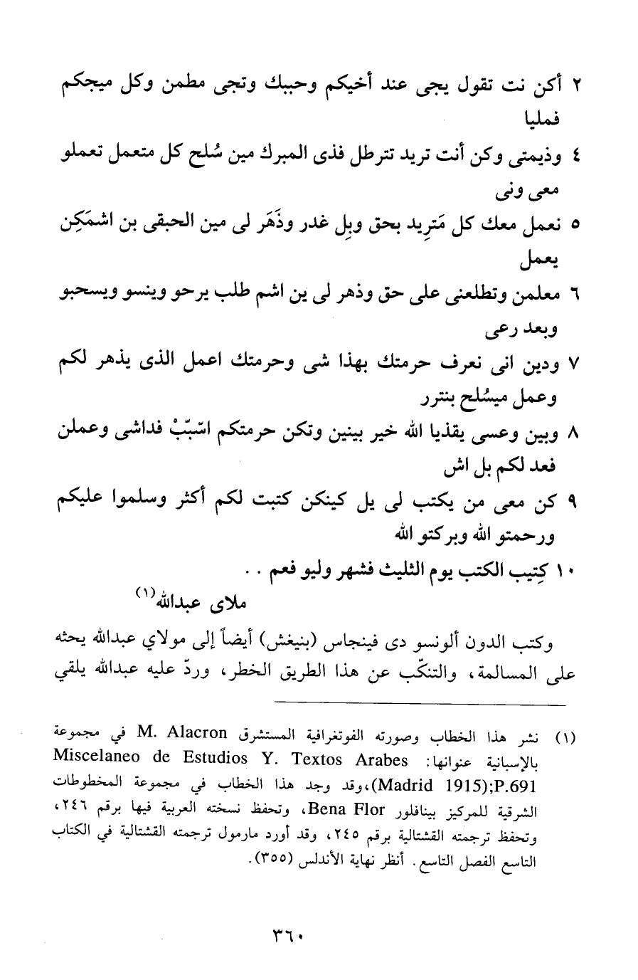 (1) نشر هذا الخطاب وصورته الفوتغرافية المستشرق M. Alacron في مجموعة بالإسبانية عنوانها: Miscelaneo de Estudios Y. Textos Arabes (Madrid 1915) ; P. 691، وقد وجد هذا الخطاب في مجموعة المخطوطات الشرقية للمركيز بينافلور Bena Flor، وتحفظ نسخته العربية فيها برقم 246، وتحفظ ترجمته القشتالية برقم 245، وقد أورد مارمول ترجمته القشتالية في الكتاب التاسع الفصل التاسع. أنظر نهاية الأندلس (355).